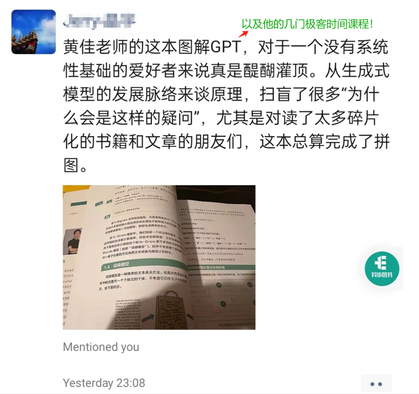 目前,我的代表作品是极客时间的课程《LangChain实战课》《零基础实战机器学习》等,书籍《大模型应用开发:动手做AI Agent》《GPT图解:大模型是怎样构建的》《零基础学机器学习》等。非常有幸,这些作品得到了不少朋友的认可,这种认可鼓励着我一次次挑战自我,持续的学习并创作出新的内容。
