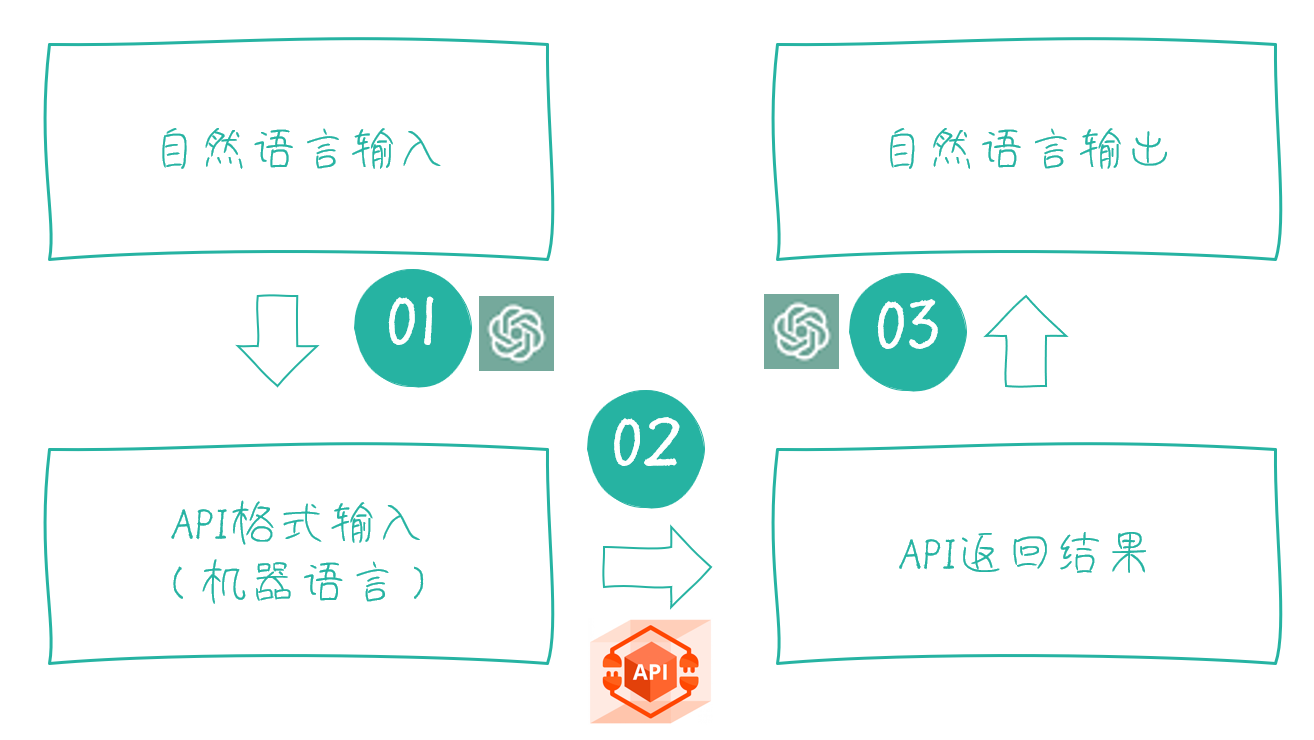 因此,这是一个从【自然语言输入 ->(1) API格式输入(机器语言)->(2) API返回结果(机器格式)->(3) 自然语言输出的】三步骤过程。其中,大语言模型模型在(1)、(3)处发挥作用,而天气API则是在(2)处发挥作用。