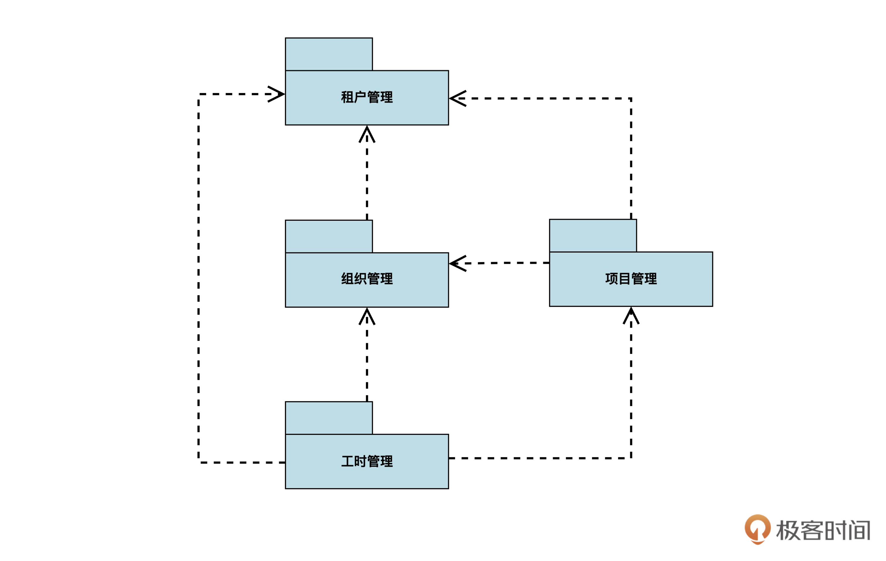 也就是说,我们把模型分成了4个模块,分别是租户管理、组织管理、项目管理和工时管理。是不是感觉清晰多了?