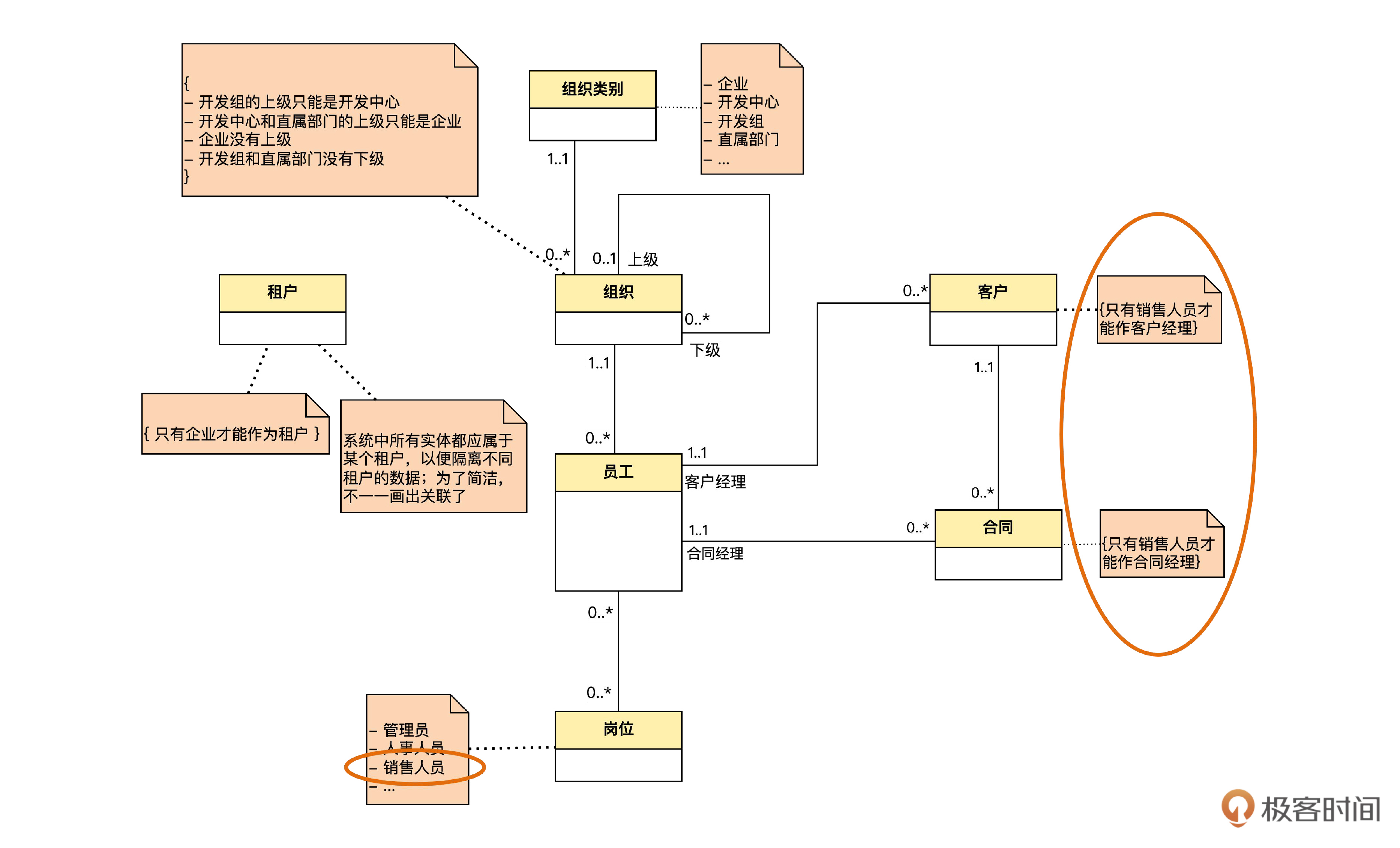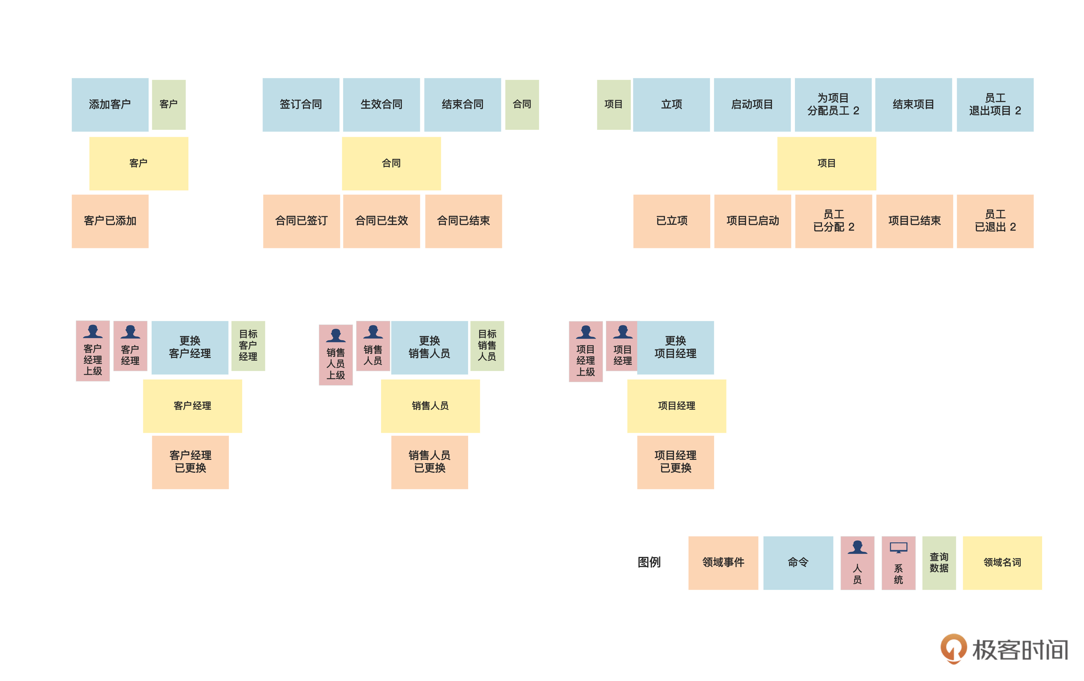 经过上面的梳理,我们已经把剩余的模型梳理得差不多了。但是,在事件风暴中咱们还遗留了一个问题:怎么处理客户经理上级、销售人员上级和项目经理上级这几个概念?现在看来,它们不太像是独立的实体,而更像是某种关系。
