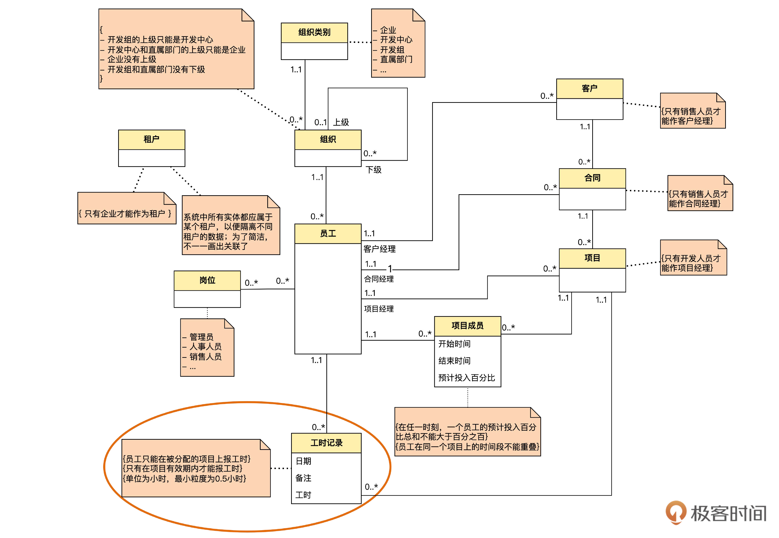 接下来,为了处理报工时的需求,你又增加了工时记录实体,以及相关的业务规则: