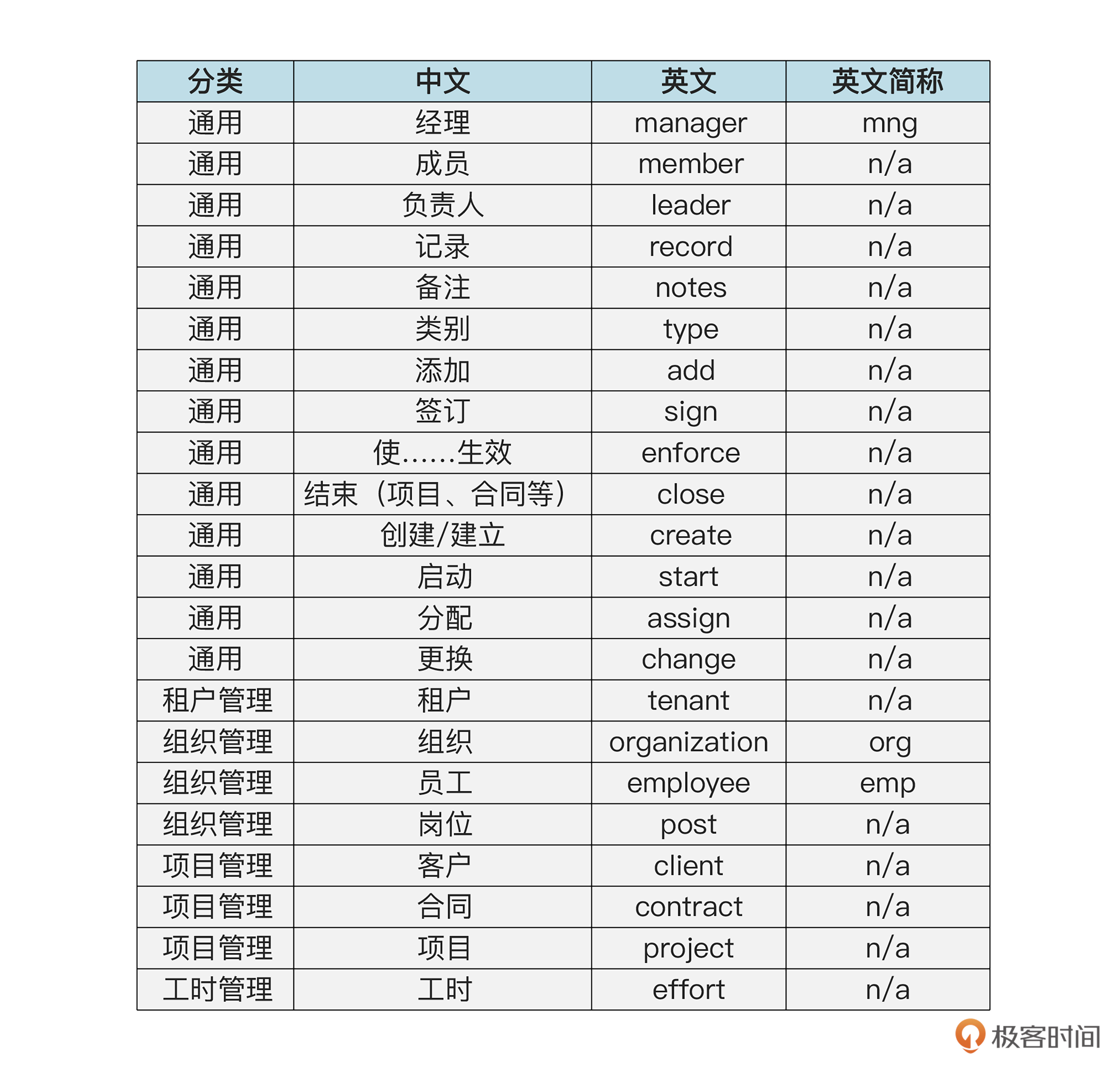 第二,是可以用于后续编程中的命名。按照DDD的要求,程序中的各种命名也需要统一,并且需要与领域模型中保持一致。我们会在词汇表中列出英文全称和缩写,以达到这个目的。