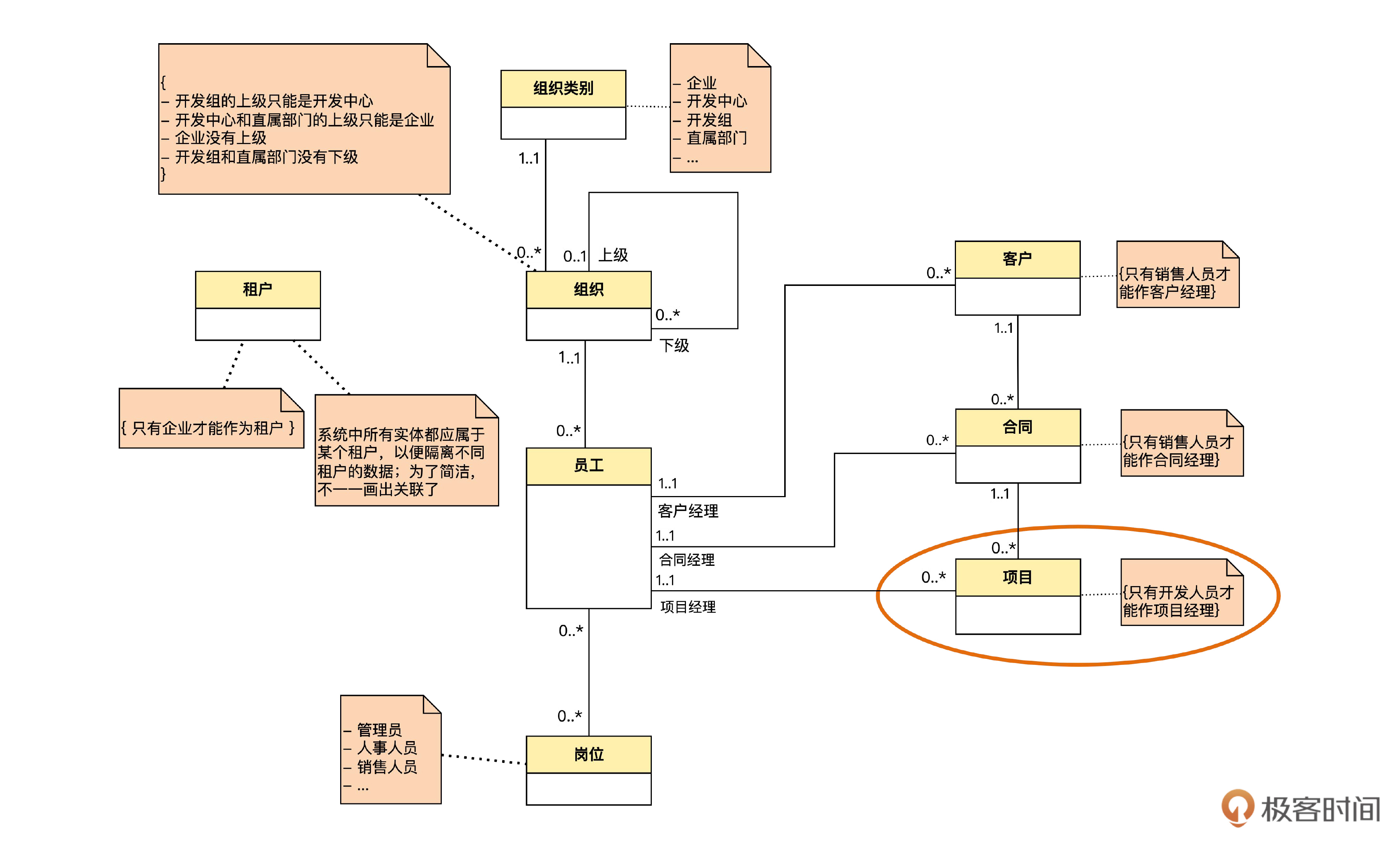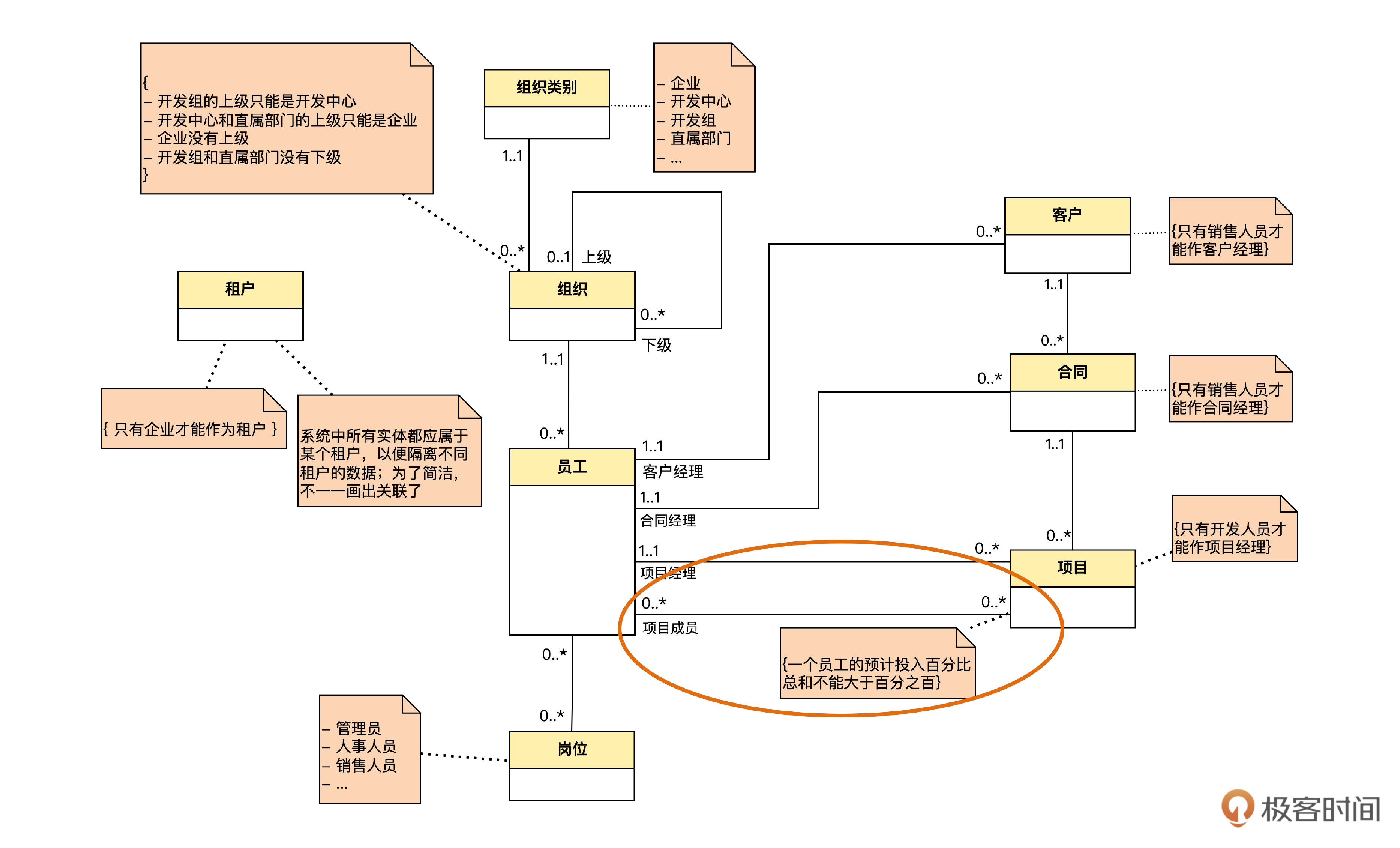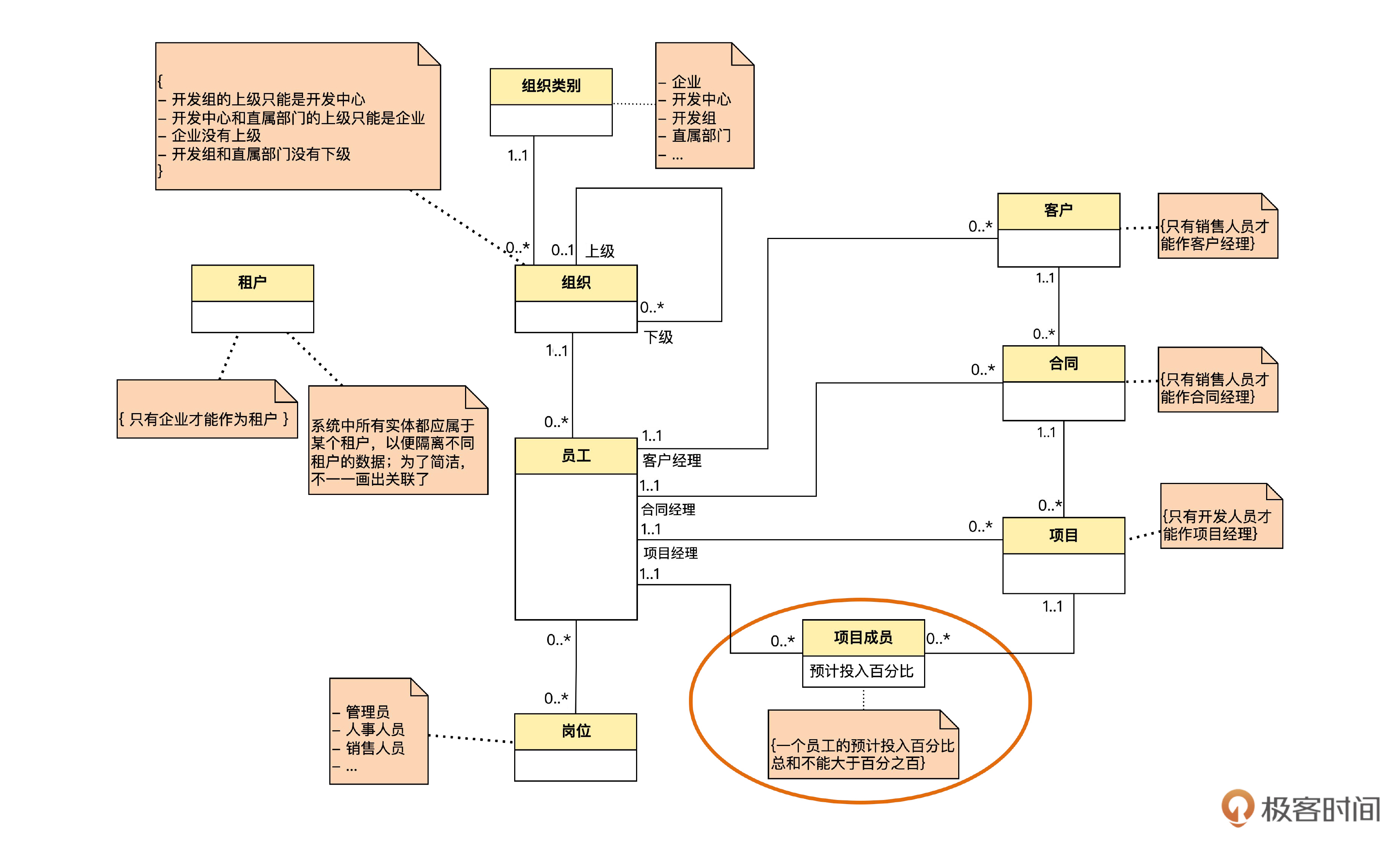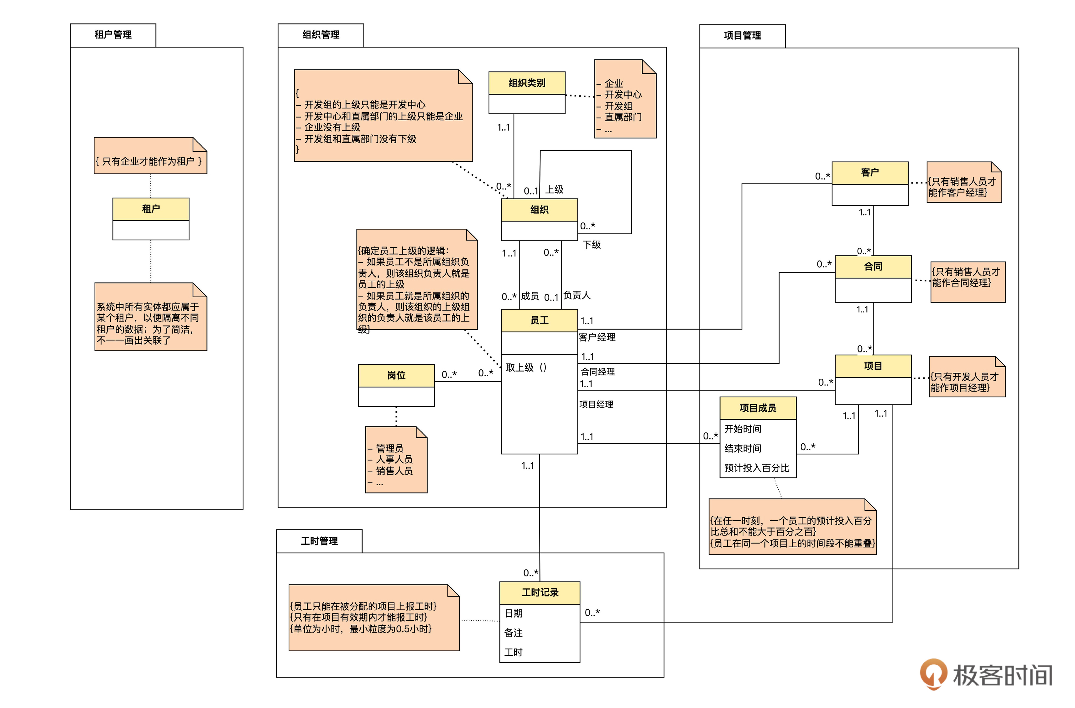 [上节课]咱们介绍了领域建模的一些概念,也一起完成了有关租户、组织和员工的领域建模。今天这一讲,我们继续对项目管理、人员分配和工时登记部分进行建模。