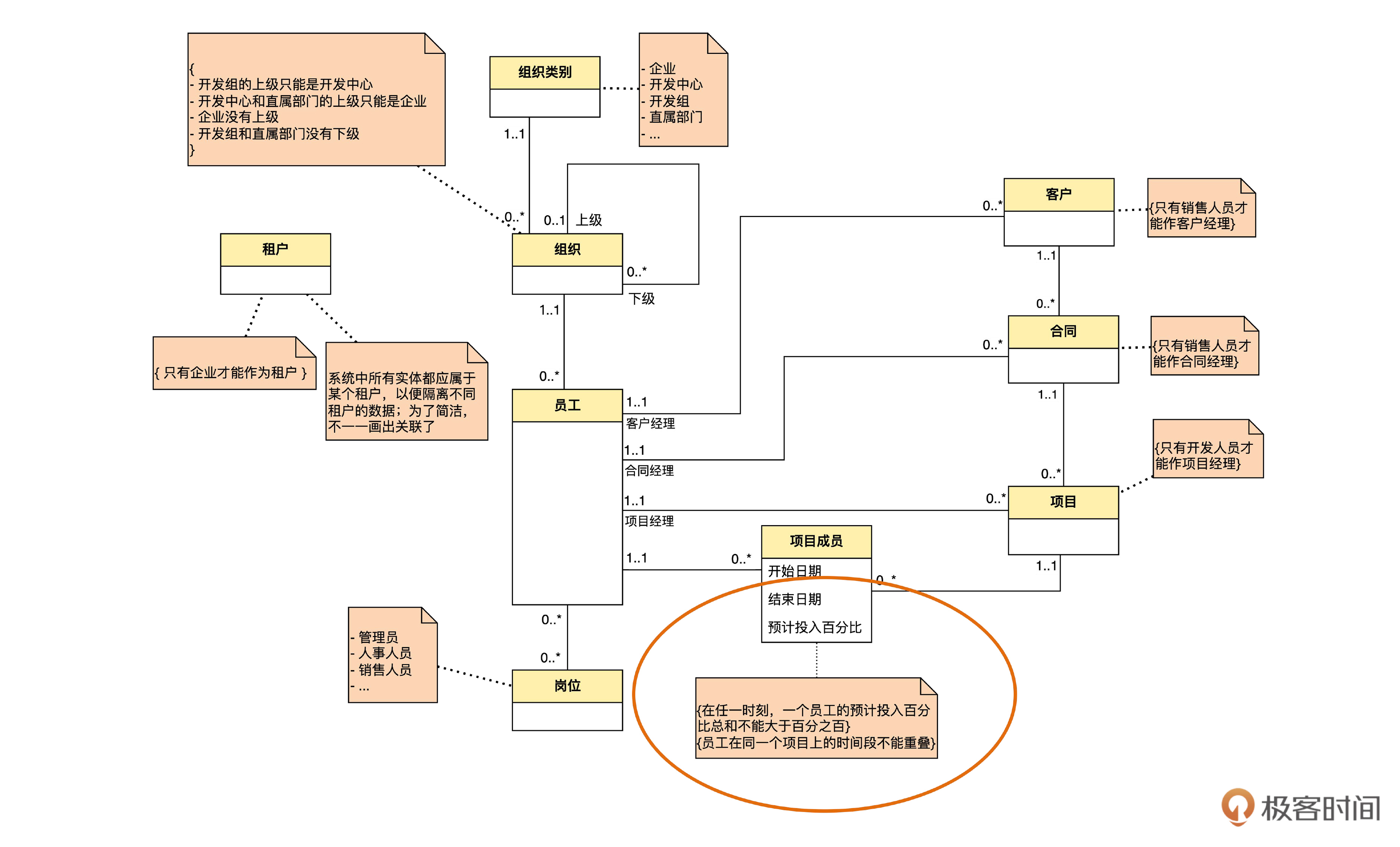 首先,我在图里面的员工和项目之间增加了一个表示“员工被分配到项目上”的关联,同时把“一个员工预计的投入百分比不能大于百分之百”的规则也标注出来。