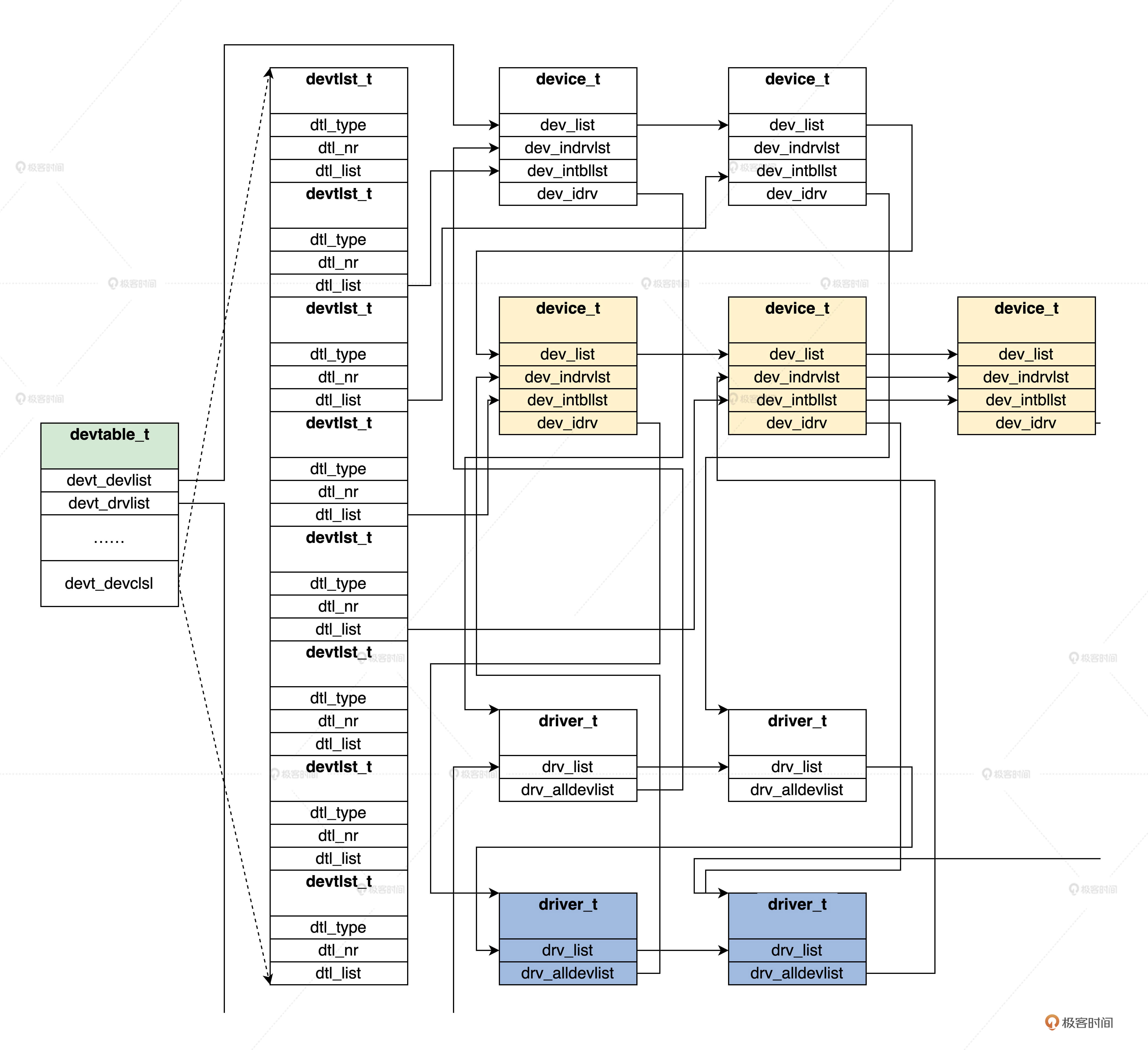 一、数据结构 有一个全局devtable_t结构变量osdevtable,用于管理全部驱动程序及设备,其中包括: A、全局驱动程序链表,保存全部驱动【driver_t结构】 B、全局设备链表,包括各种设备类型的链表【devtlst_t结构】,每个devtlst_t中包括了某一类型的全部设备链表【device_t结构】