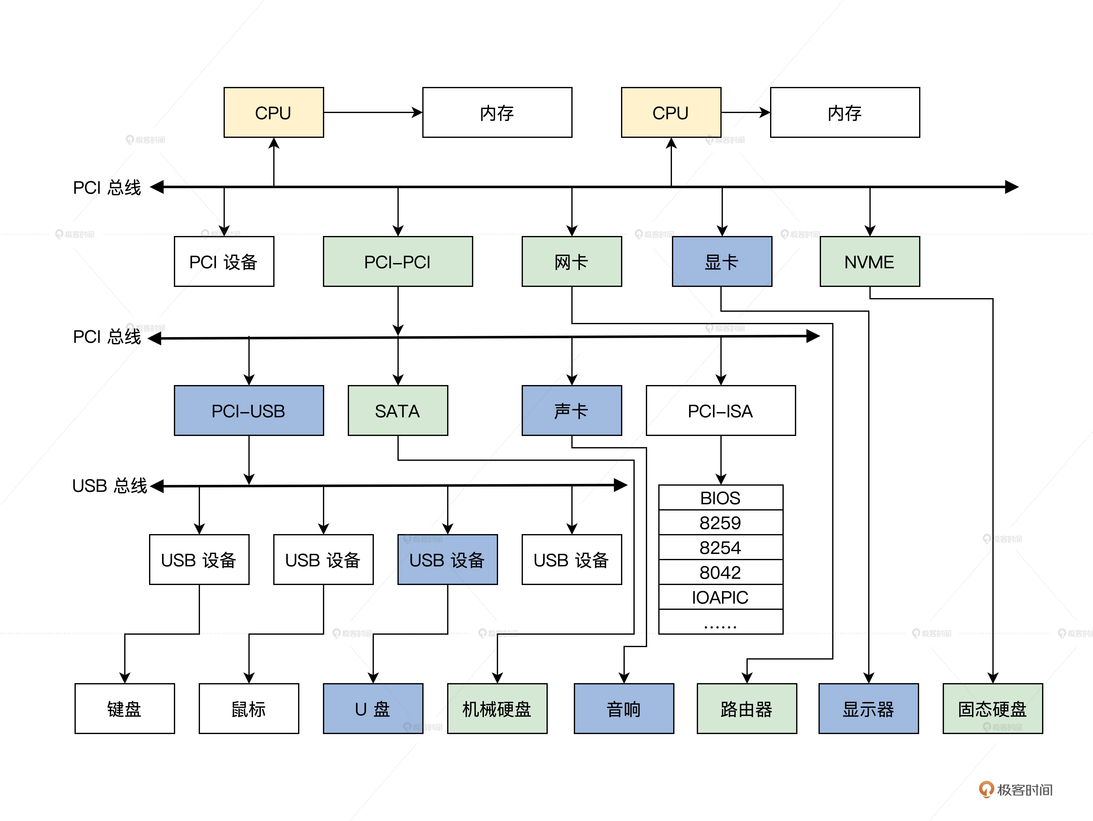 上图是一个典型的桌面系统,你先不用管是物理上怎么样连接的,逻辑上就是这样的。实际可能比图中有更多或者更少的总线。但是总线有层级关系,各种设备通过总线相连。这里我们只需要记住,计算机中有很多种类的设备,脑中有刚才这幅图就行了。