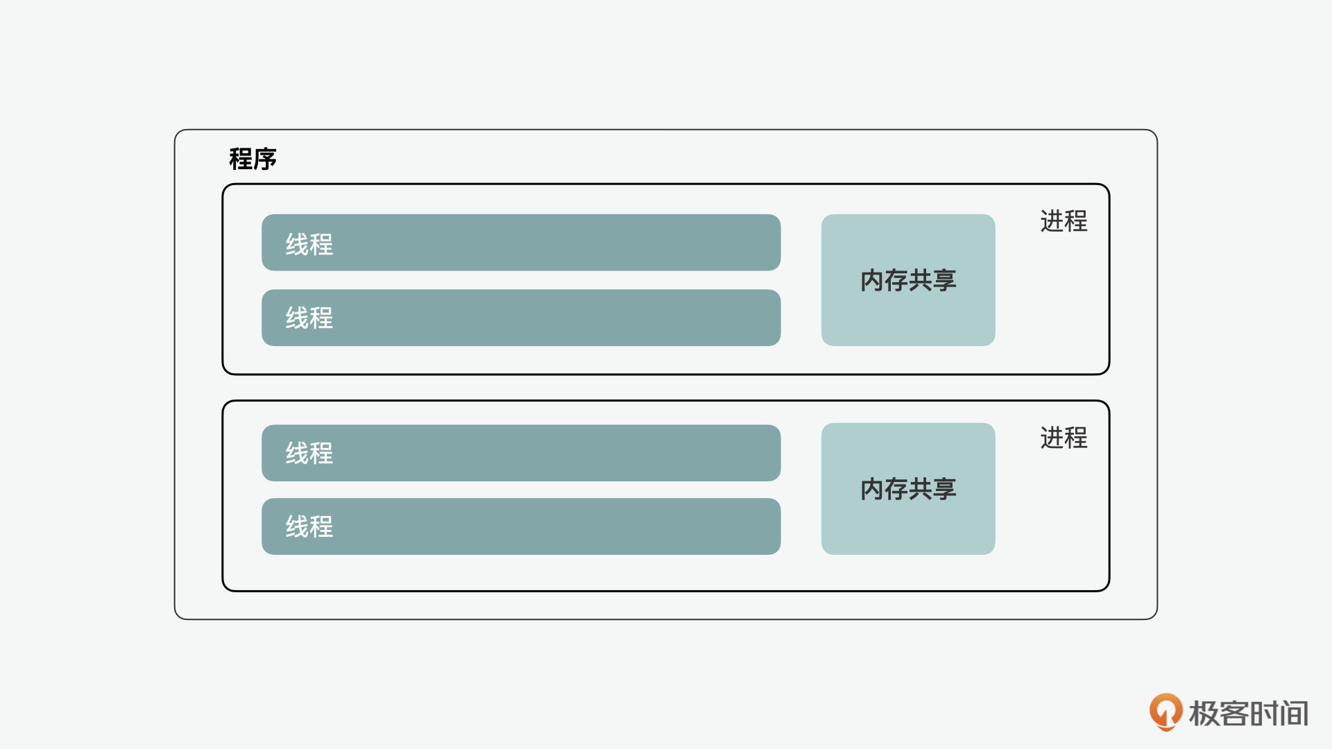 在说到JavaScript中的并发和并行前,我们先来看看程序、线程和进程之间的关系。**在一个程序当中,可以有多个进程。在一个进程里,也可以有多个线程。**内存在进程间是不共享的,而在线程里,是可以共享的。通过下图,你可以有更直观的理解。