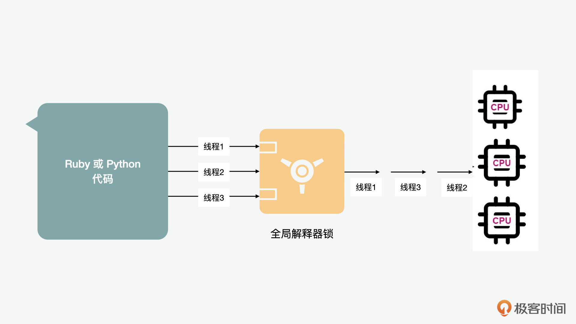 和前端不同,在很多的后端高级语言,如Ruby或Python中,无论CPU是单核还是多核,线程都是被全局解释器锁(GIL,global interpreter lock)限制并行的,而只支持并发。所以在做多线程开发的时候,一定要注意并行是否受限制,因为如果并行受限,只允许并发的话,那么线程间切换的成本可能高于它带来的好处。在JavaScript的环境中,并没有限制线程的GIL锁,但是JS也有自己的限制,就是它会限制对象在线程间直接的共享,所以这从某个角度来讲也影响了线程在前端的使用。