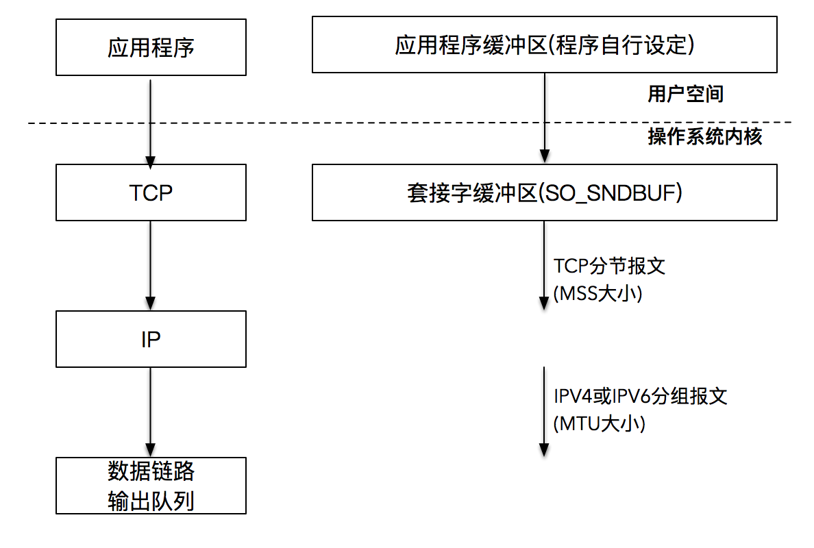 别忘了,我们的操作系统内核是很聪明的,当TCP连接建立之后,它就开始运作起来。你可以把发送缓冲区想象成一条包裹流水线,有个聪明且忙碌的工人不断地从流水线上取出包裹(数据),这个工人会按照TCP/IP的语义,将取出的包裹(数据)封装成TCP的MSS包,以及IP的MTU包,最后走数据链路层将数据发送出去。这样我们的发送缓冲区就又空了一部分,于是又可以继续从应用程序搬一部分数据到发送缓冲区里,这样一直进行下去,到某一个时刻,应用程序的数据可以完全放置到发送缓冲区里。在这个时候,write阻塞调用返回。注意返回的时刻,应用程序数据并没有全部被发送出去,发送缓冲区里还有部分数据,这部分数据会在稍后由操作系统内核通过网络发送出去。