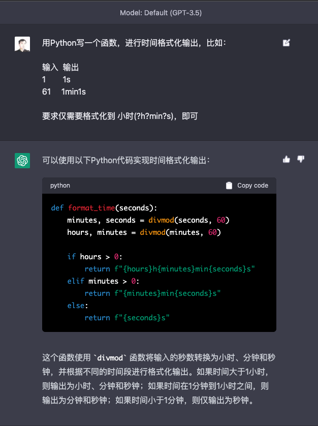 we use the `divmod` built-in function to get the quotient and remainder of `seconds` divided by 60. This is assigned to the variables `minutes` and `seconds`, respectively. - Next, we do the same thing with `minutes` and 60, assigning the results to `hours` and `minutes`. - Finally, we use string interpolation to return a string formatted according to how many hours/minutes/seconds are left.