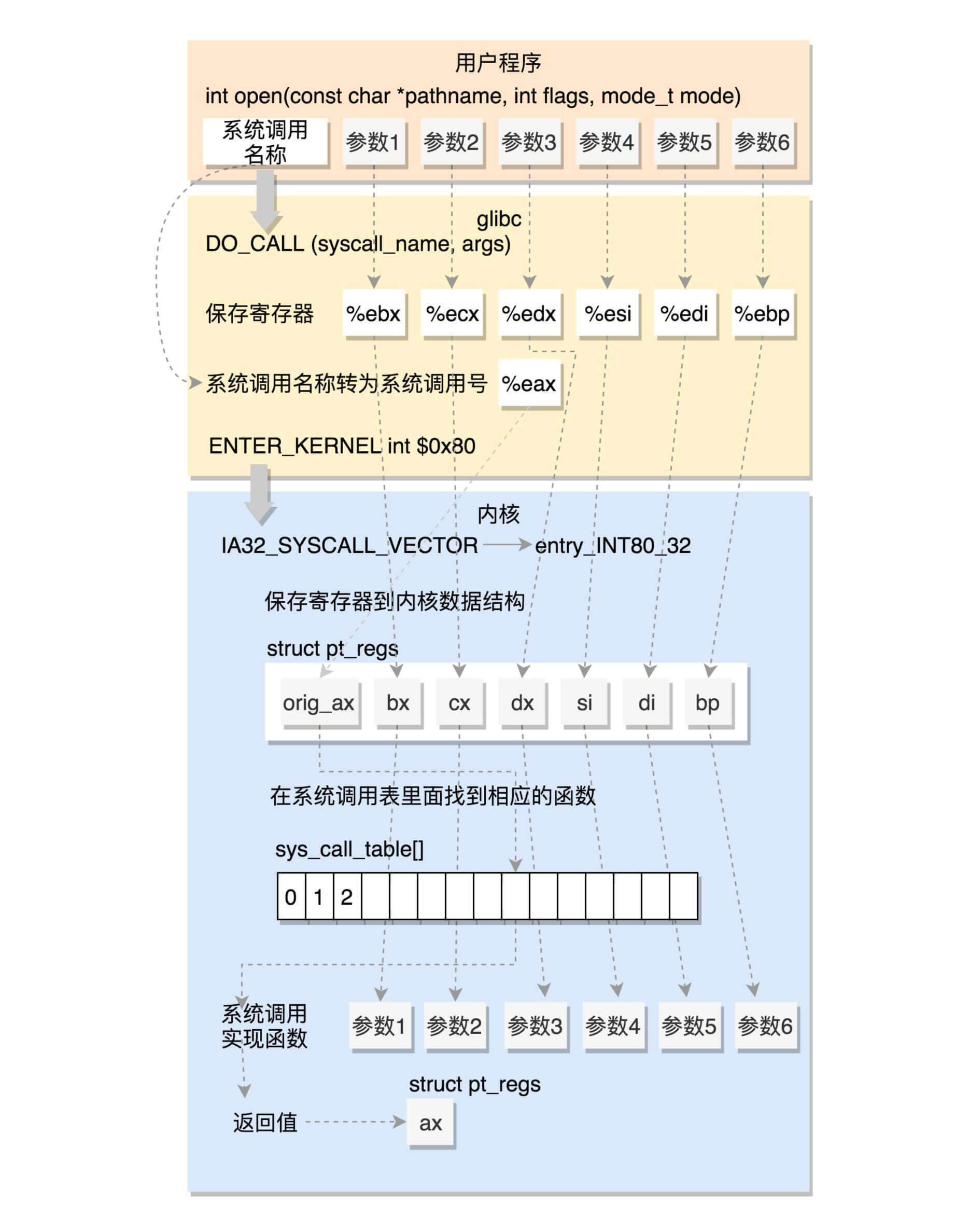 这里我总结一下32位的系统调用是如何执行的。