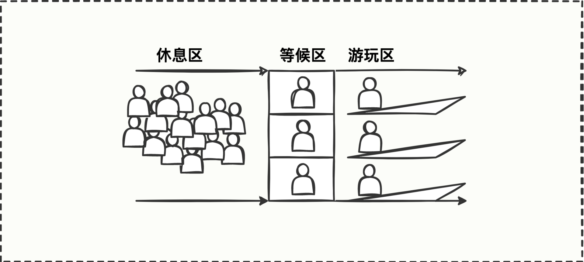 流量控制也是一样的,休息区就像源源不断的请求流量,等候区就是控制流量的逻辑,游玩区就是Dubbo接口的业务逻辑,因为业务逻辑(游玩区)目前只能容纳 3 个请求(小朋友),就需要把多余的请求控制住或者遣散回去,直到一个请求离场了,那下一个请求就可以进去玩了。