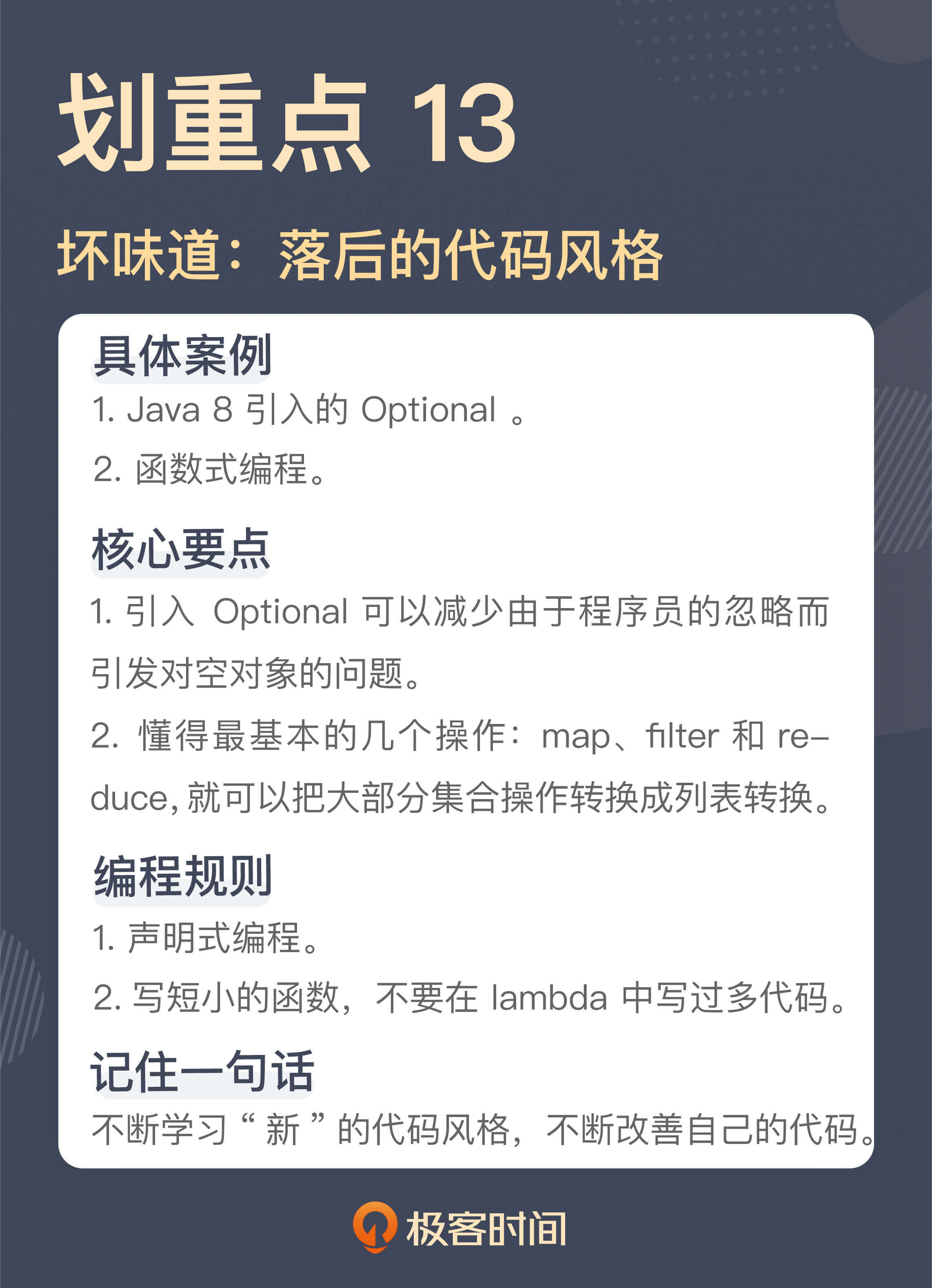 一种编程风格会过时,本质上是因为它存在问题,新代码风格就是用更好的方案解决它,就像今天讲到的 Optional。所以,我们要不断学习新引入的语言特性,了解它们给语言带来的“新”风格,而不要停留在原地。