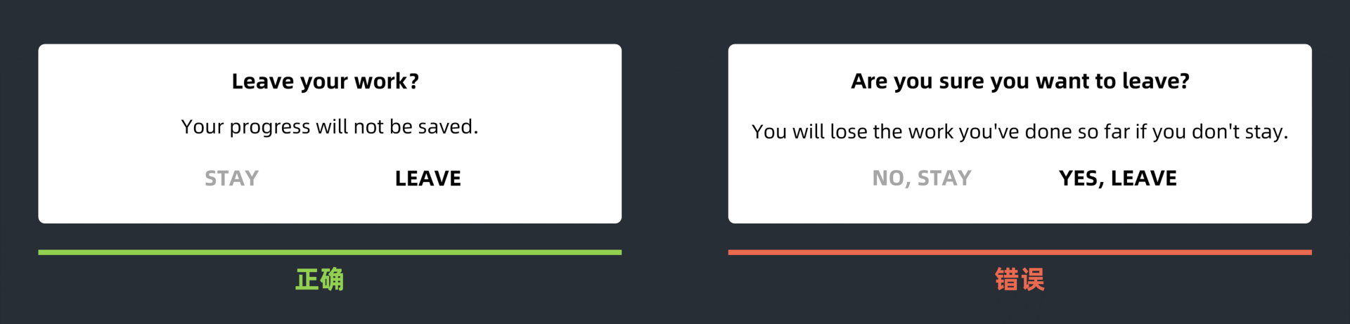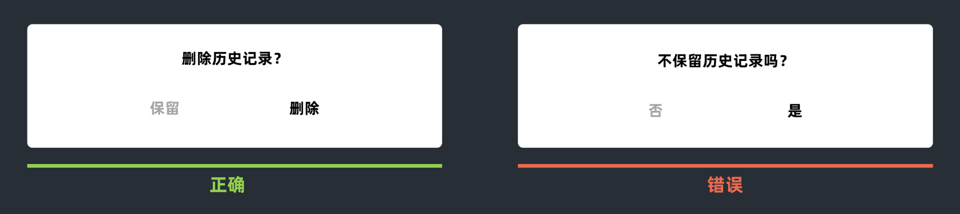 在讲人话的基础上,所有的界面元素必须让用户一目了然地辨别出来,不能出现歧义。比如问句中不要出现双重否定句式,所有的按钮上的文字不要仅仅用简单的“是”和“否”,而要写明具体、明确的动作。我们要让用户一眼就能看懂接下来干什么,而不需要再经过一次脑回路去理解下一步的意图。