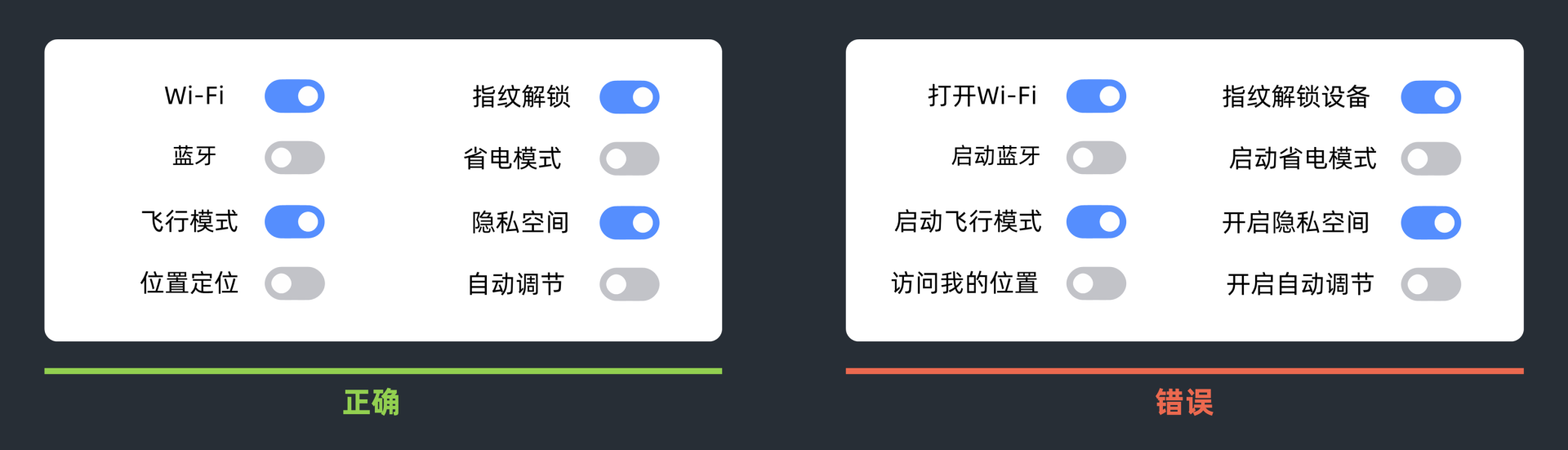 在前面“无歧义”中提到交互按钮一定要是动词,但是对于开关项的交互控件最好用名词描述,比如智能家居管理的开灯、关灯的控件。这个开关边上的描述一定是灯,而不是开灯。当然有些词汇既可以作为动词,也可以理解为名词。