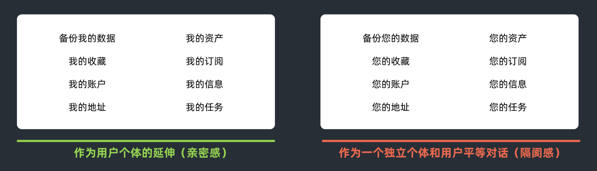 在日常生活中,你永远总是和身边的人用类似上面左半部分的表述来沟通,但是在当今应用界面上,右半部分的表达却比比皆是。这种习惯一定要改掉。