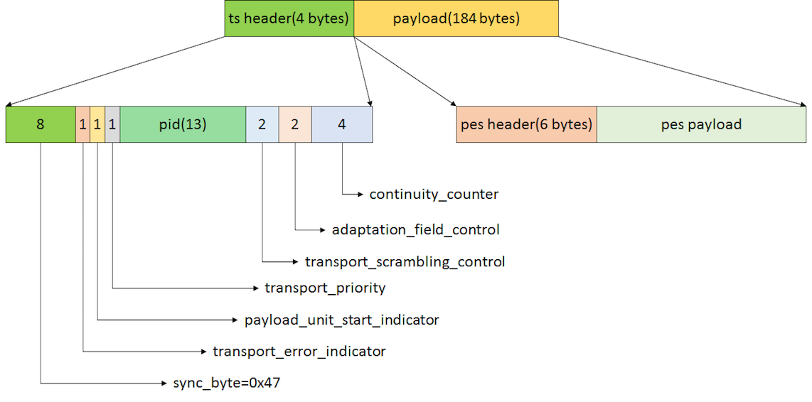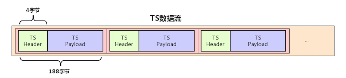 我们再进一步细化,TS 数据流由 TS Header 和 TS Payload 组成。其中,TS Header 占 4 字节,TS Payload 占 184 字节,即 TS数据流总长度是 188 字节。