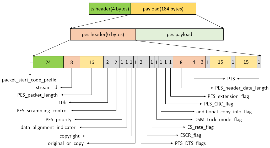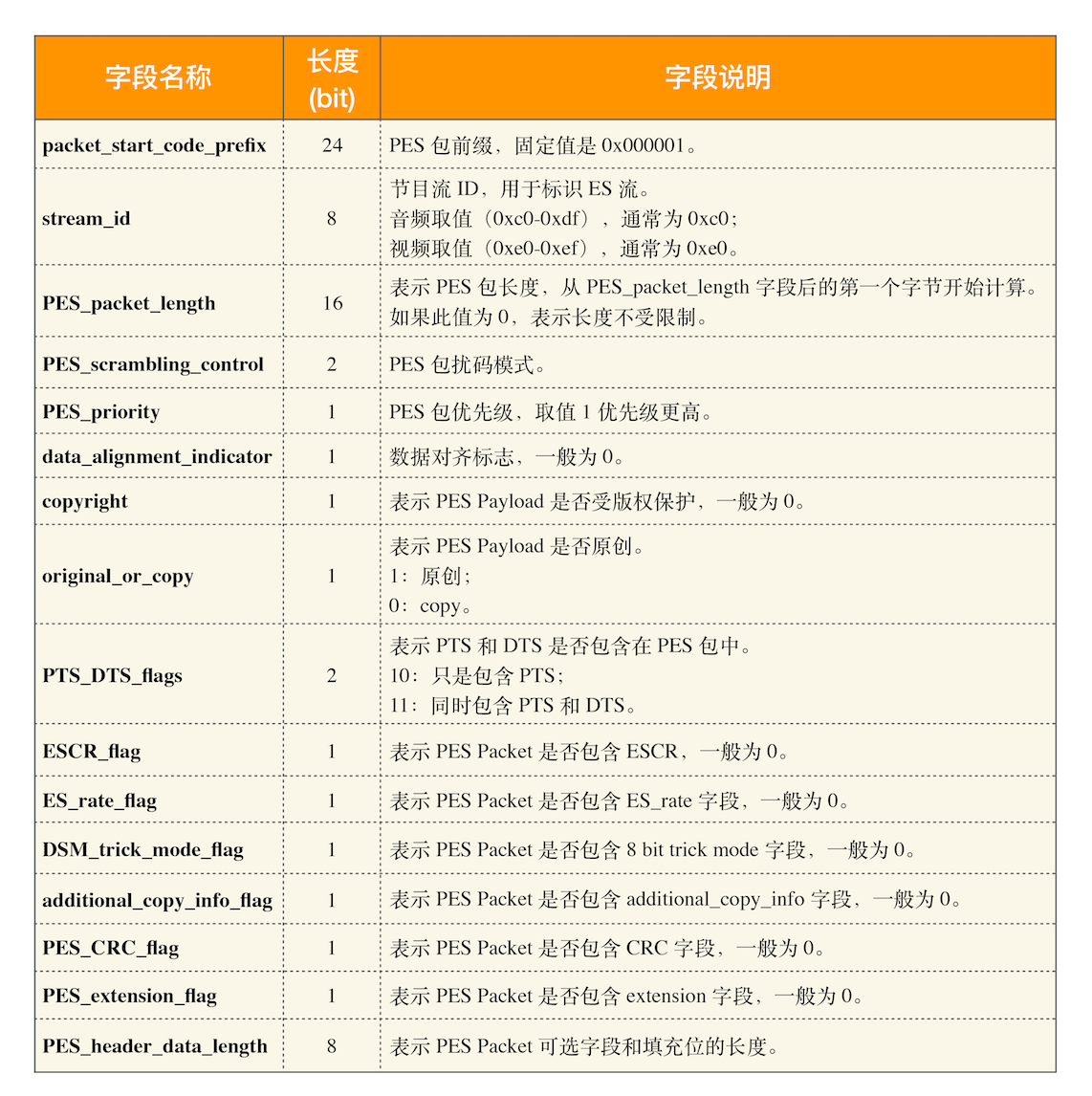 PES Packet 作为 TS 数据流的 Payload,也有自己的 Header,如下图所示: