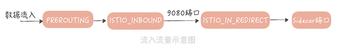假设服务的节点部署在9080端口上,Sidecar开发的端口是15001,那么流入流量的流向如下: