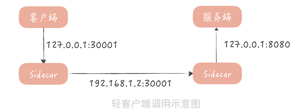 在这种方式下,RPC客户端会通过配置的方式,知道Sidecar的部署端口,然后通过一个轻量级客户端,将调用服务的请求发送给Sidecar。Sidecar在转发请求之前,先执行一些服务治理的策略,比如,从注册中心中查询到服务节点信息并且缓存起来,然后从服务节点中,使用某种负载均衡的策略选出一个节点等等。