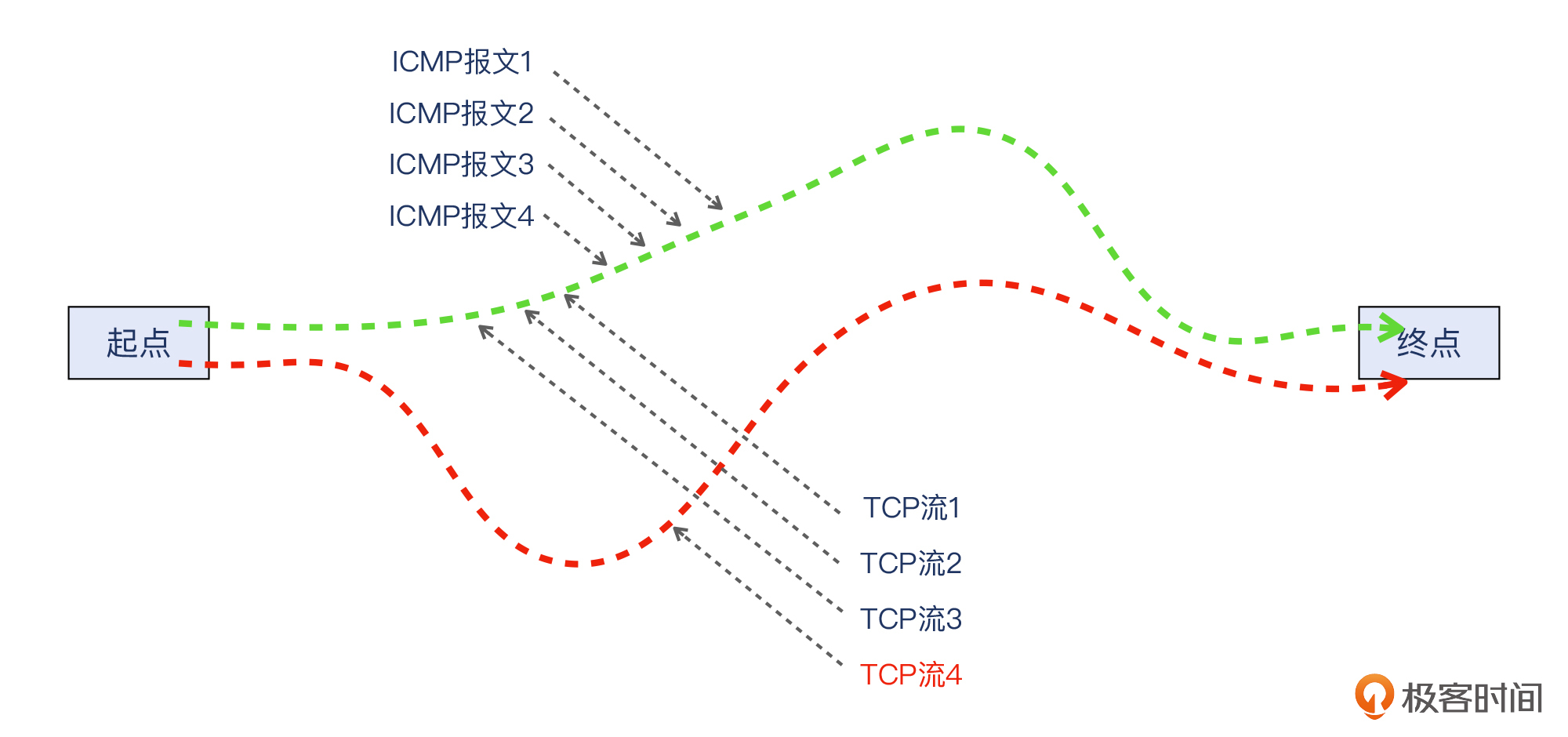 其实,这时候你可能已经想到第二个问题的答案了:**为什么TCP有时候连续丢包,有时候又可以呢?**我们每次发起新的TCP连接的时候,用的源端口一般跟前一次连接是不同的,所以就会造成它跟ICMP的明显区别: