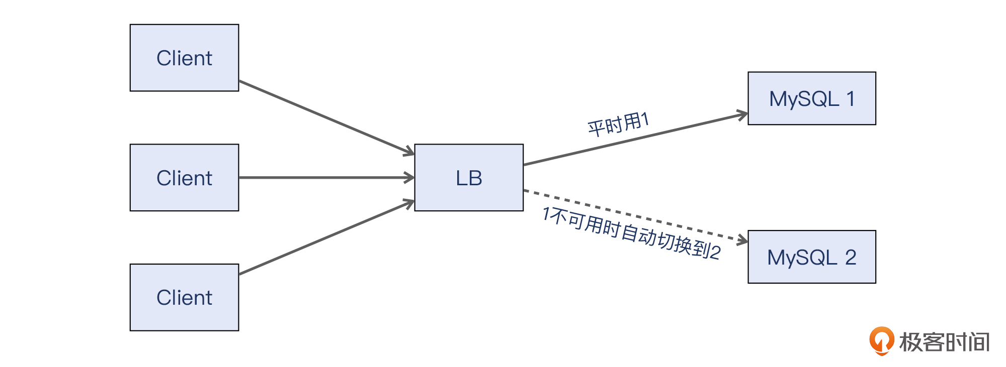 这个服务的具体架构是这样的:客户团队从他们的客户端发起TCP连接到这台LB上的VIP,这个VIP后面是两台MySQL主机,LB把请求转发给其中的一台。这里我们使用了LB的一个特性,就是可以平时只启用一台后端主机,只有当这台主机离线时,LB才会自动把流量切换到另外一台上。