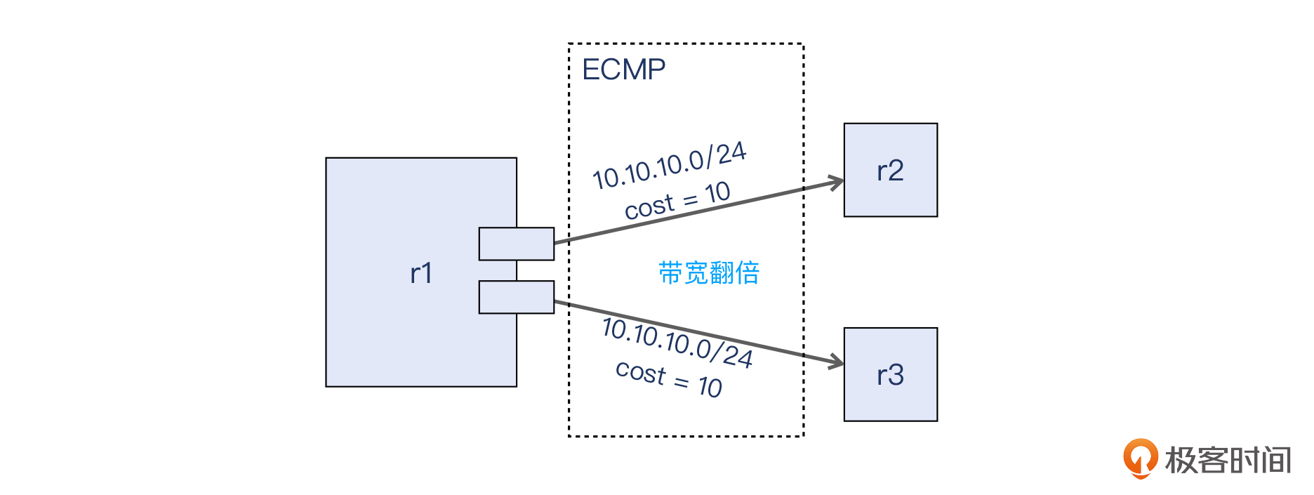 这个特性就是 ECMP,全称是equal-cost multi-path,它可以让路由器同时使用多条链路,这样就使得通往同一个网段的带宽,变成了原先的好几倍。我们来看看下面的示意图: