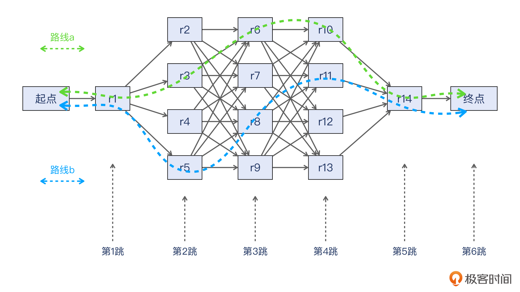 如果网络报文也有思想,面对ECMP这个场景可能会很兴奋了:“我终于不用每次都走一样的路径了,总算有多种选择了!”就像下图展示的这样,报文可能会走绿色的路线a,也可能是走蓝色的路线b,或者任何别的可行的路线。