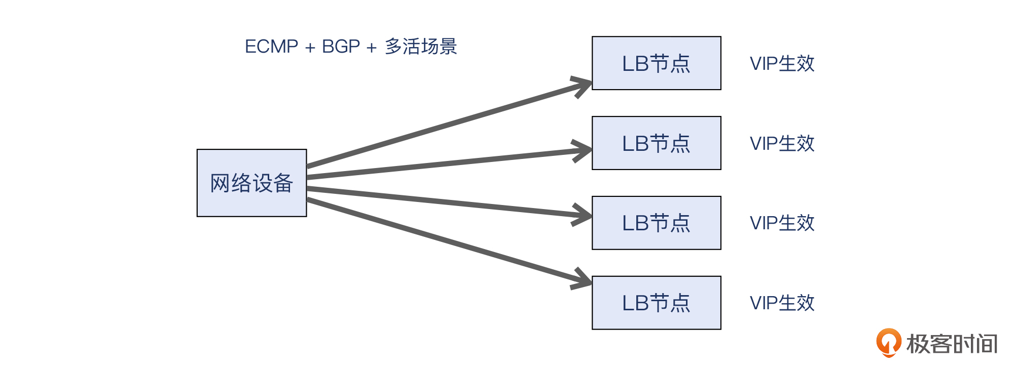 所以ARP是肯定行不通的,而ECMP配合BGP/OSPF就可以发挥作用了。这些LB节点都会启用BGP或者OSPF这样的路由协议,而不是ARP协议,并跟上联网关进行BGP配对。这样的话,网关收到流量后,会认为这多个LB节点不再是终端设备,而是跟它一样的next-hop路由器,再加上ECMP的加持,流量就能相对均匀地分发到这些LB上。这就实现多活了。我们看一下示意图: