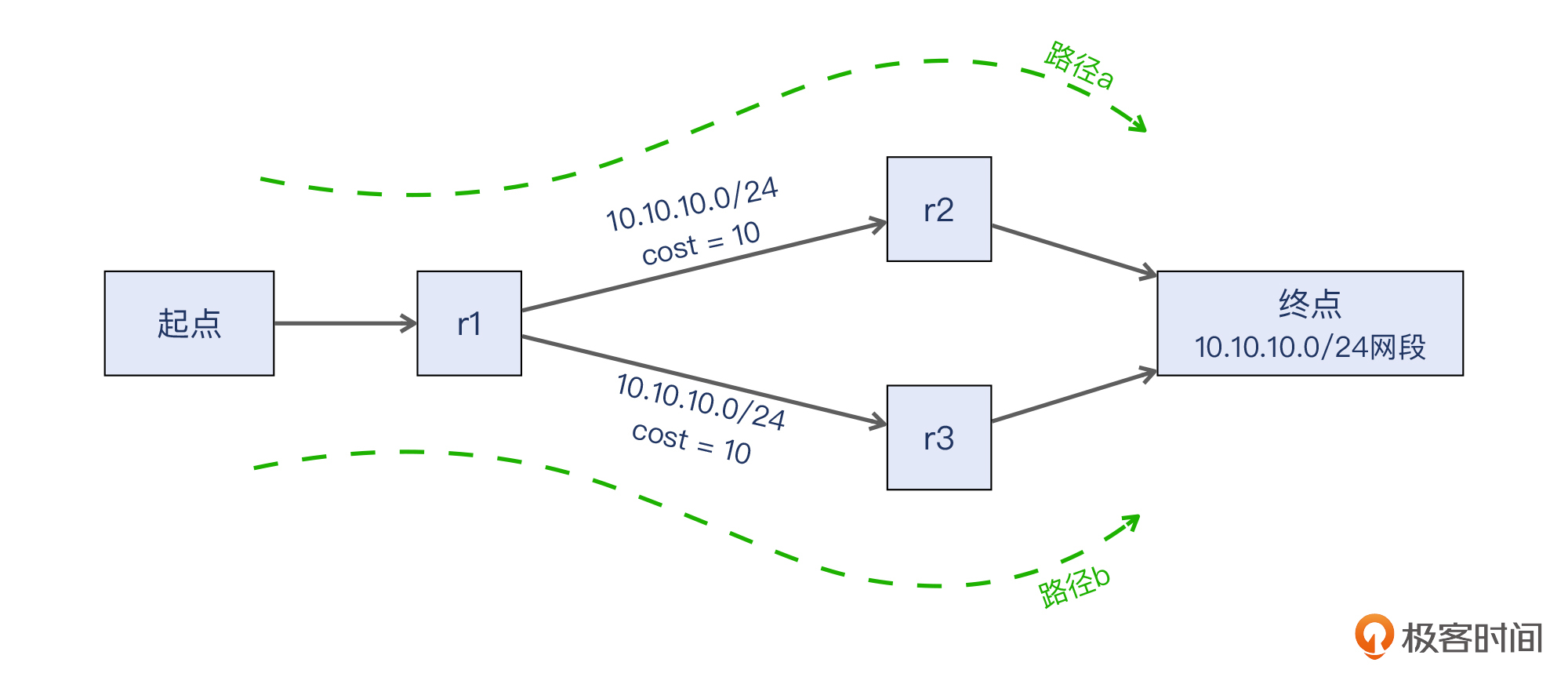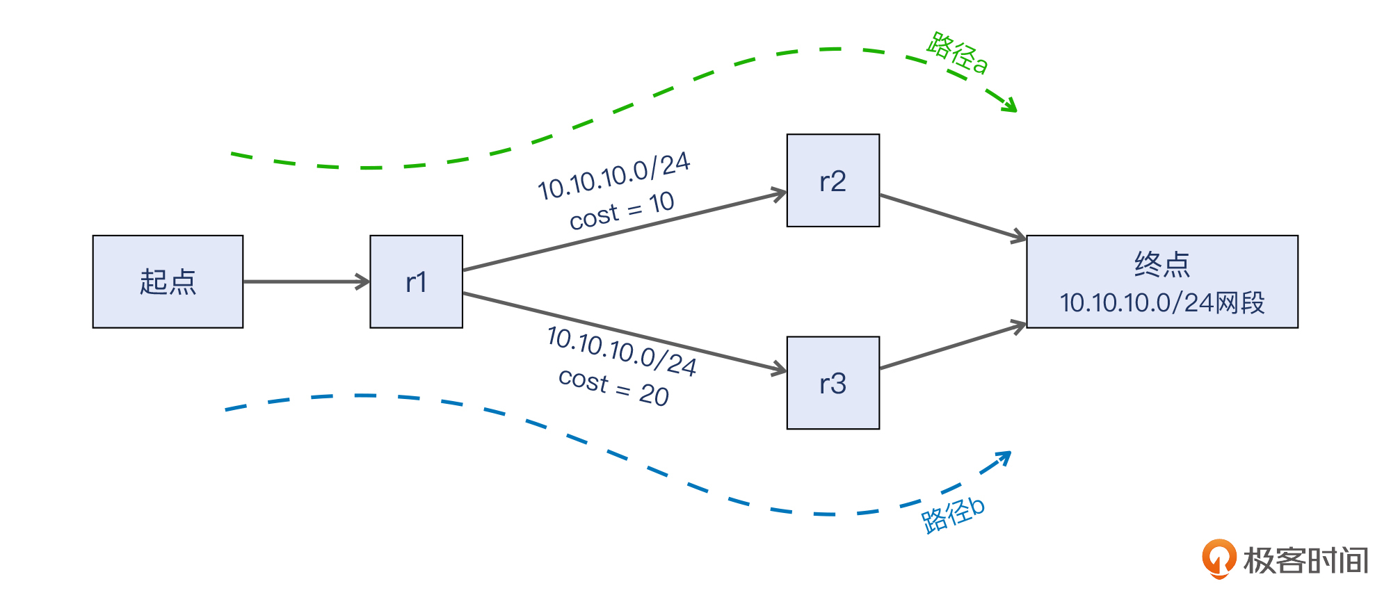 那么,假设有这样一个网络场景:一个起点连接到路由器r1,它有两条10Gbps的线路连接到后面的两个节点,分别是cost为10的r2和cost为20的r3,而r2和r3都连向终点10.10.10.0/24这个网段。那么实际上从起点到终点的路径有2条,也就是下图中的路径a和路径b。