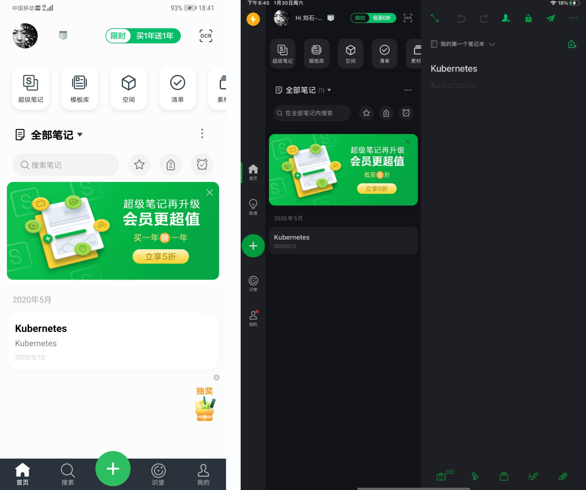比如应用导航栏的设计。在手机上导航栏需要考虑易于拇指交互,所以得放在底部。但是在Pad的应用上,导航栏应该放在更适合交互的侧边。你可以参考下图印象笔记的应用设计。
