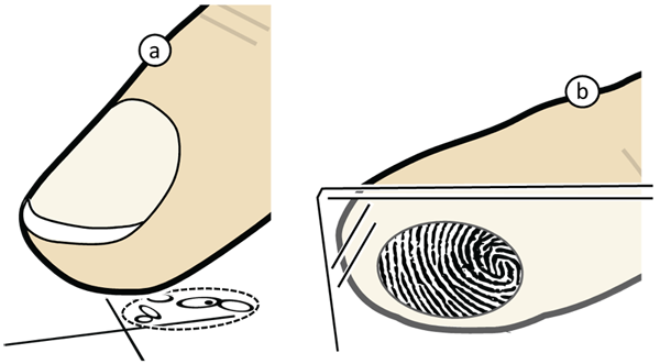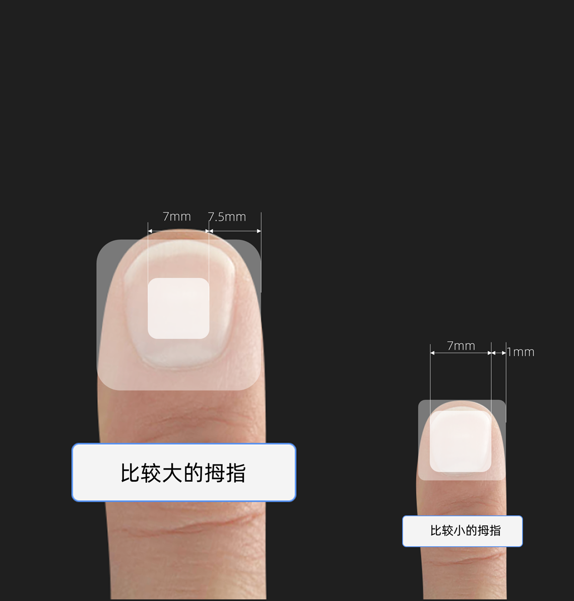从下面这个图你能看得比较清楚。由于人的指腹不是平面的,所以我们手指按压在屏幕上的大小远小于手指宽度(差不多只有手指宽度的一半)。这也就解释了为什么按钮的最小尺寸远小于手指的宽度。