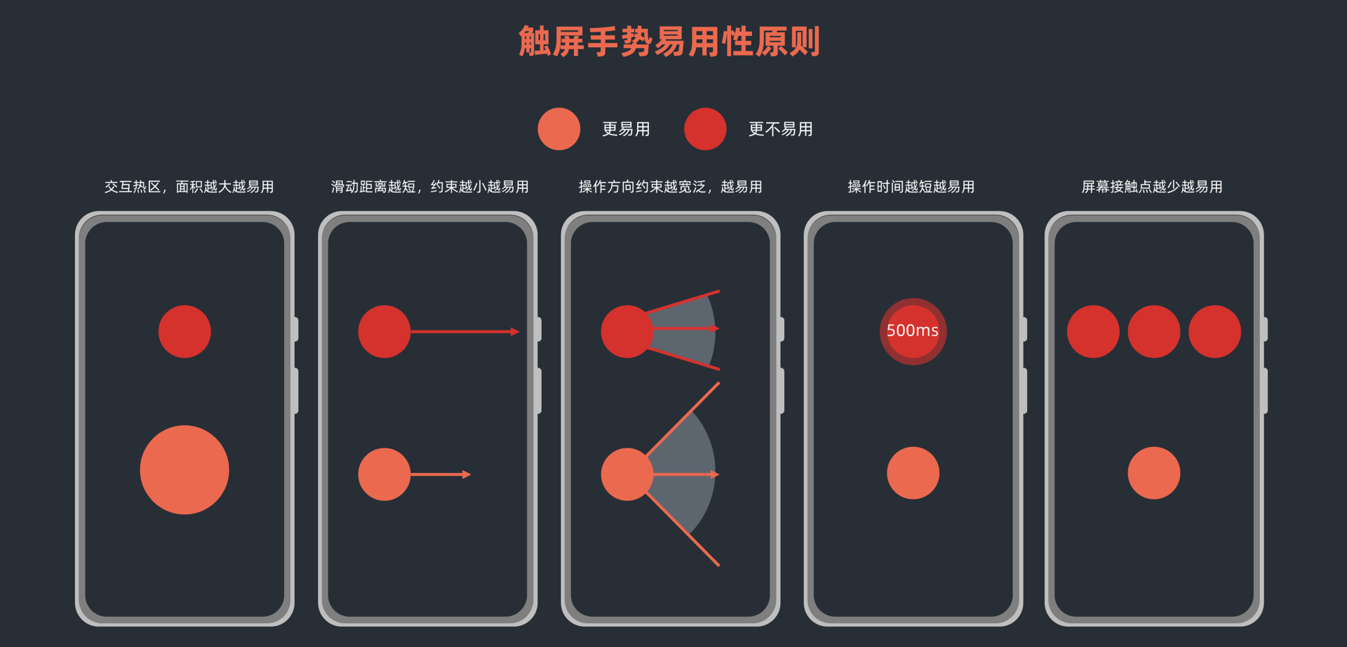 - 在屏幕上接触点越少越易用,也就是说参与交互的手指数量越少越易用。