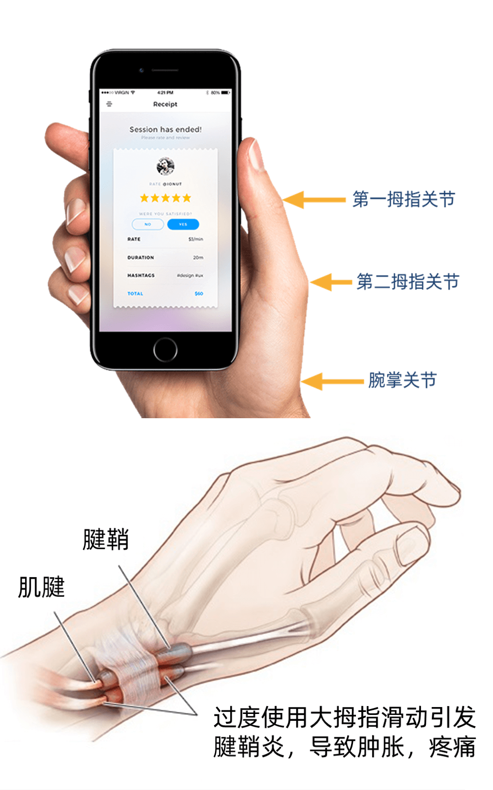 如果交互区域设计不合理导致我们过度使用腕掌关节,会造成这个关节处的腱鞘炎,进而引发不适、肿胀甚至疼痛。