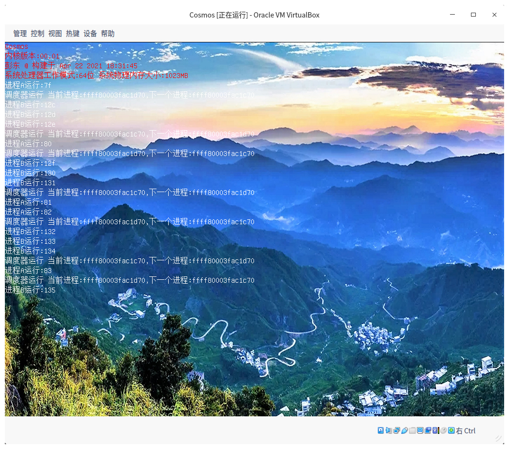 下面,我们把内核层初始化函数恢复到原样,重新打开终端切到cosmos目录下,执行make vboxtest指令,我们就将会看到如下界面。