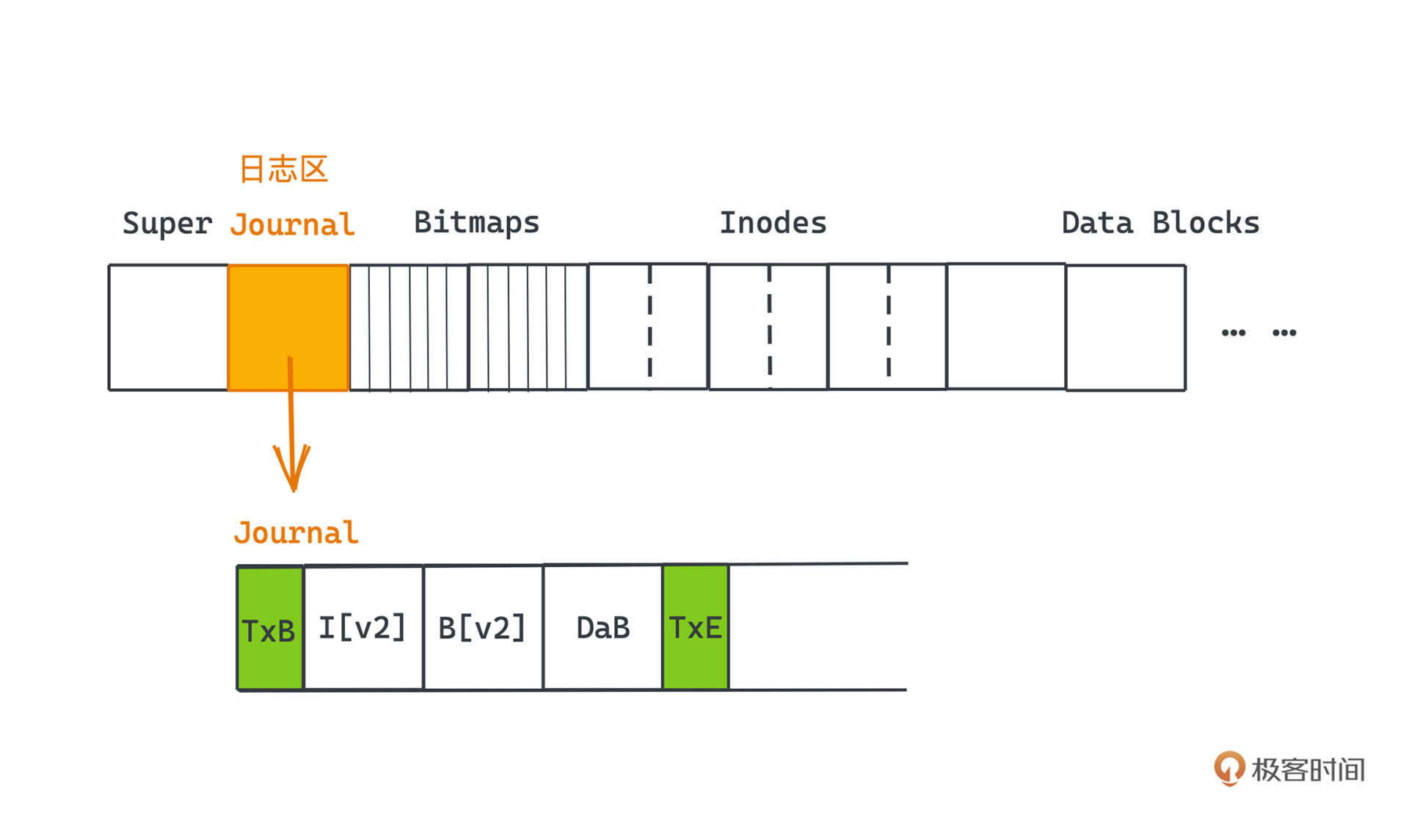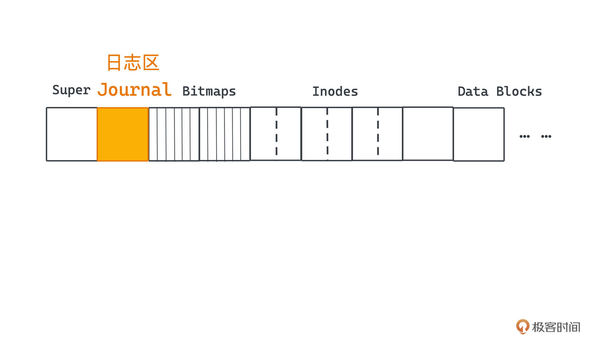 对于文件系统的布局,我们也只是需要增加一块区域用于存放日志就行,改动不是很大,这块区域我们叫做日志区(Journal)。