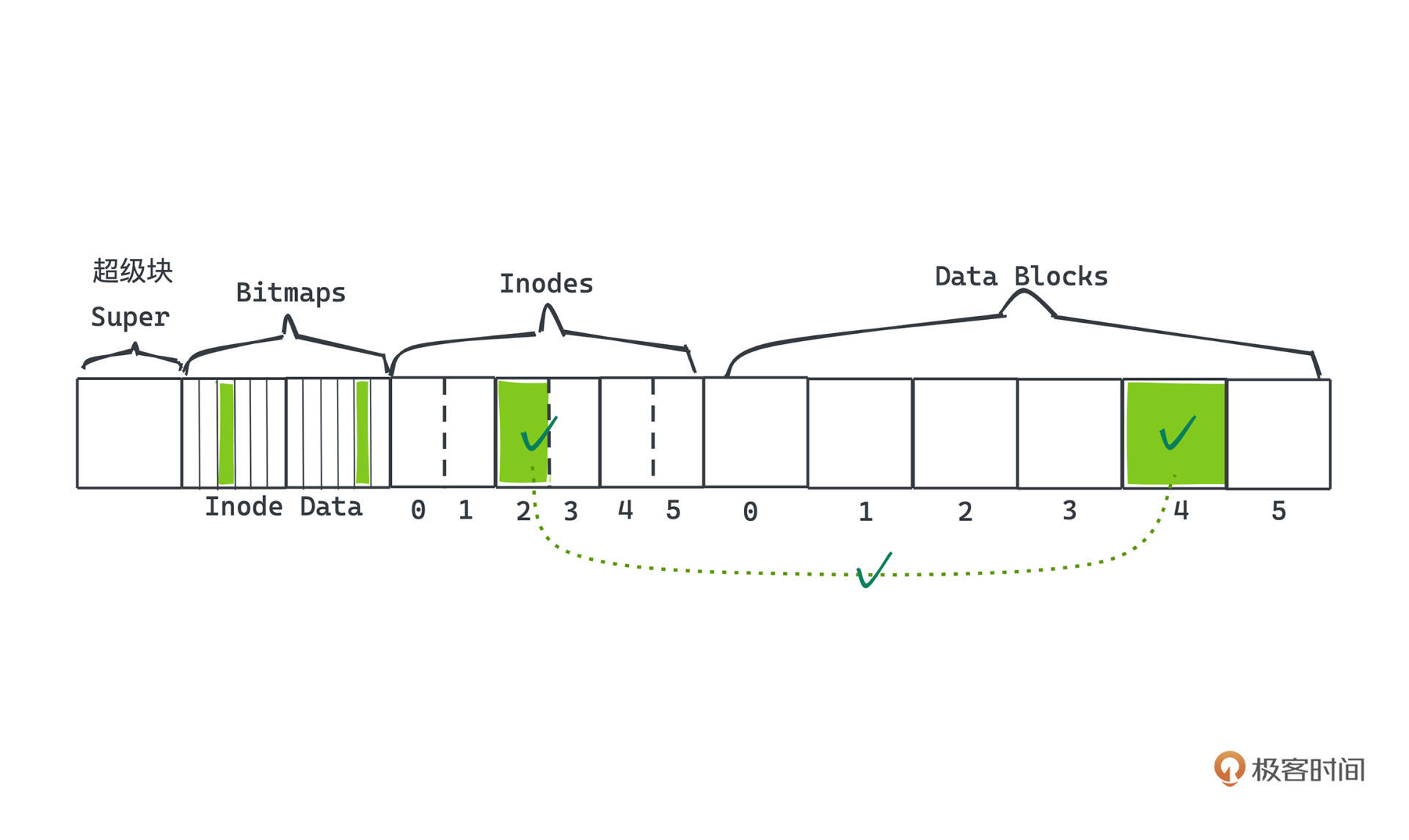 现在每个文件都对应一个Inode,它记录了所有数据块的位置,可以预想到,之后在修改、创建文件的时候,除了修改数据块区的内容,也需要修改文件的元数据和Bitmaps。比如,当我们往某个文件里追加数据,很可能就需要创建新的数据块把数据写入其中,并且在Inode上追加一个指向这个数据块的指针。