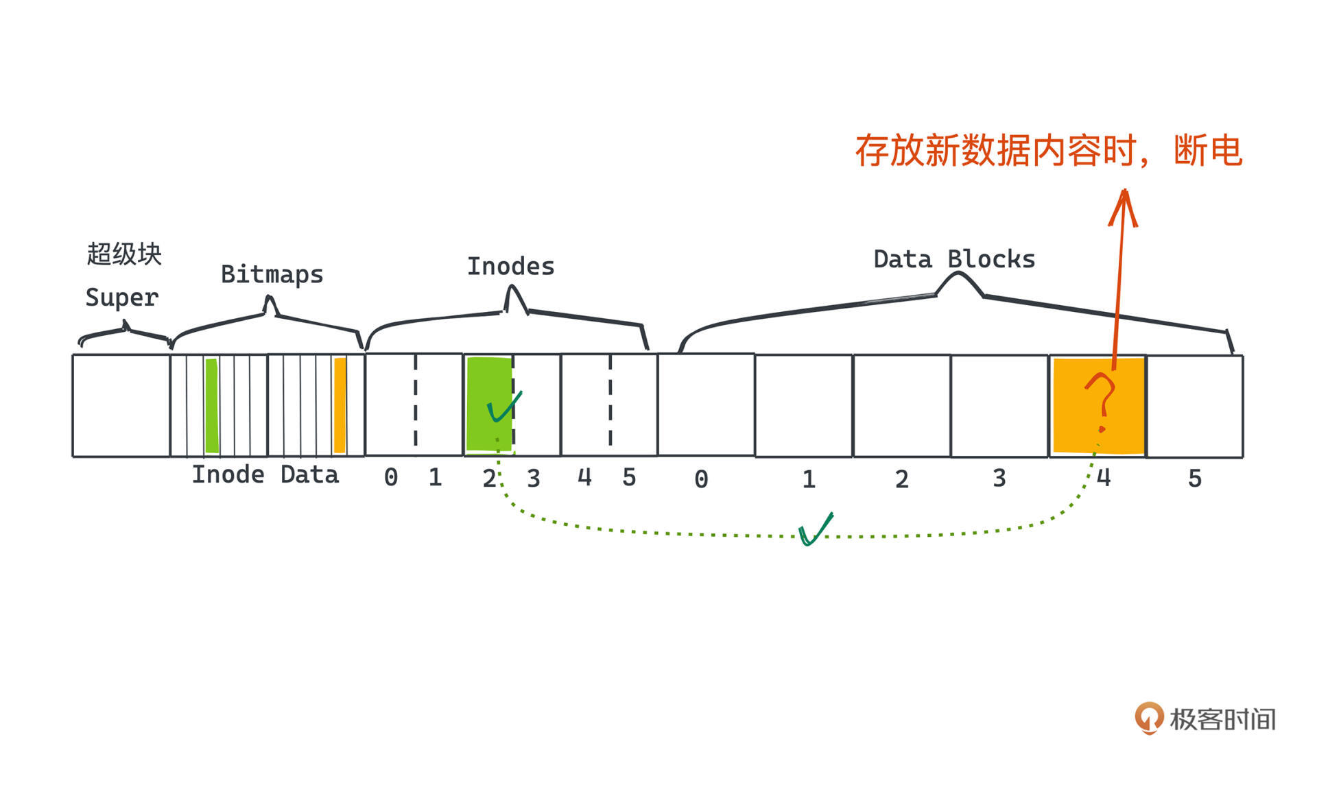 但假设,修改完Inodes了,我们把Inodes中某个指针指向了一段即将要存放数据内容的数据块,此时如果遭遇了断电,Data Blocks 上的内容是未知的,很可能是很早之前别的程序写过的数据,我们可以认为此时上面的数据是脏的垃圾数据。等系统恢复,我们重新去读取文件数据的时候,会发现也没有什么有效的依据供我们检验文件是否正常。