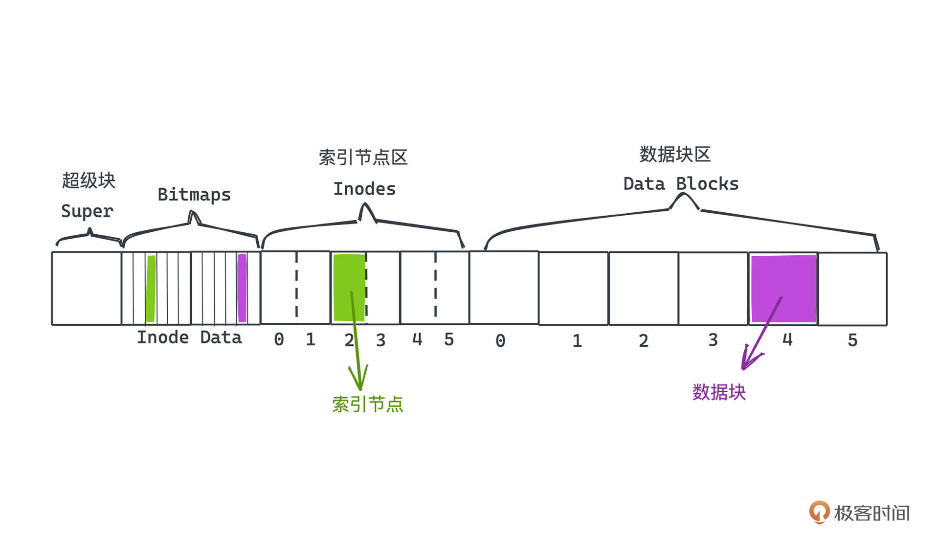 - 超级块,是文件系统中的第一个块,用来存放文件系统本身的信息,比如可以用于记录每块区域的大小;