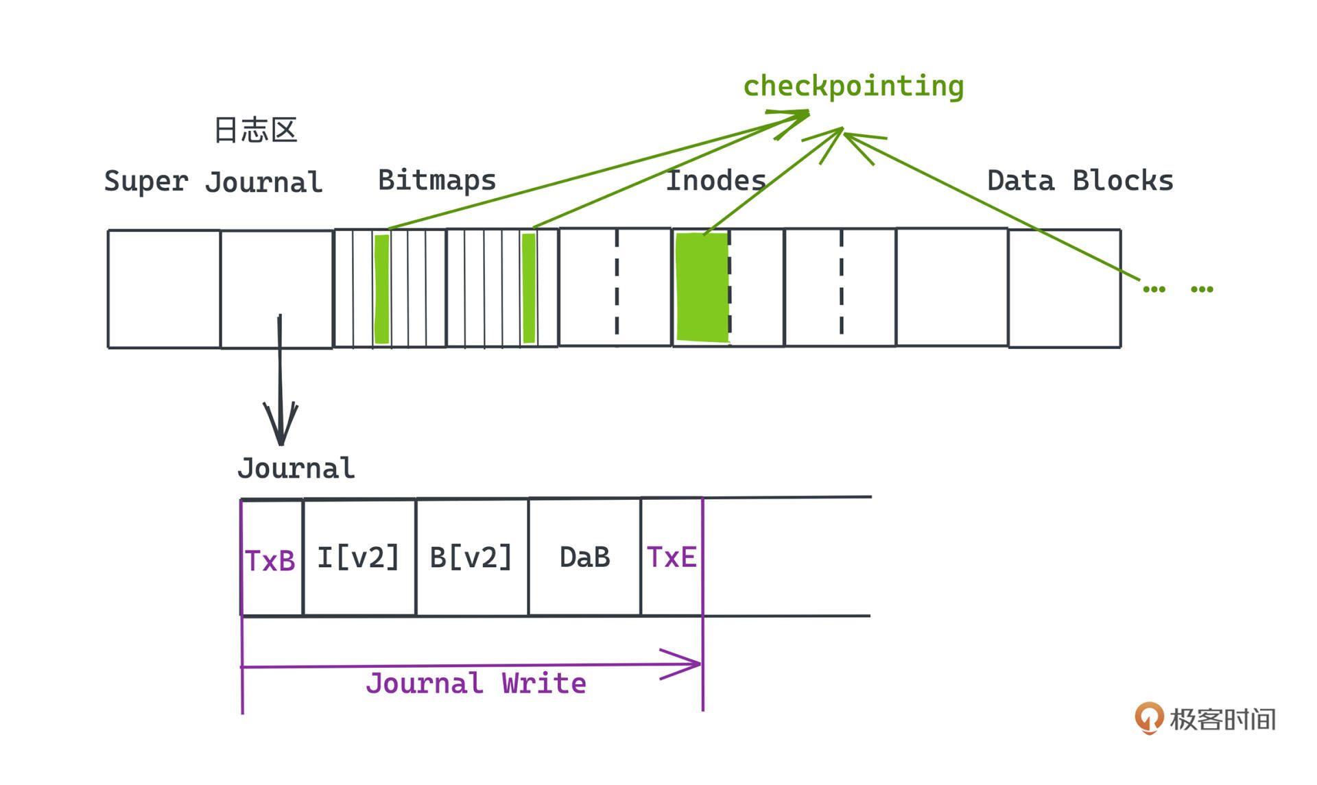 当我们完成Journal Write操作之后,就可以放心大胆地把这些实际的元数据或文件数据覆写到磁盘上对应的数据结构中了,这个步骤我们叫做 checkpointing。