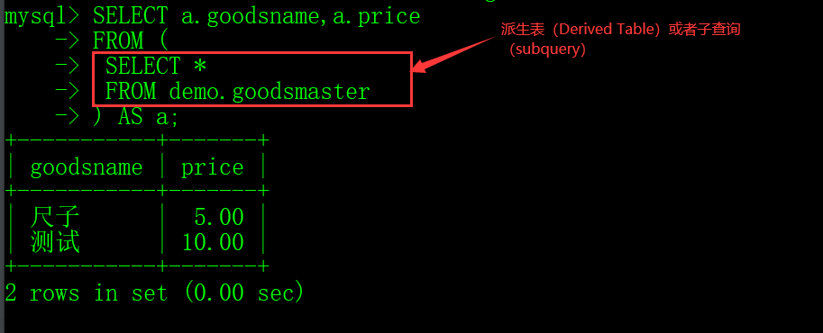 这里你要注意的是,红色框里的部分叫做派生表(derived table),或者子查询(subquery),意思是我们把一个查询结果数据集当做一个虚拟的数据表来看待。MySQL规定,必须要用AS关键字给这个派生表起一个别名。在这张图中,我给这个派生表起了个名字,叫做“a”。