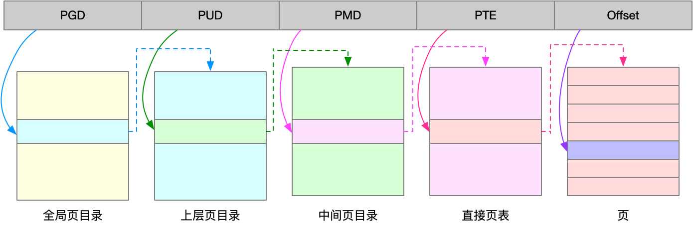 Linux 用的正是四级页表来管理内存页,如下图所示,虚拟地址被分为5个部分,前4个表项用于选择页,而最后一个索引表示页内偏移。