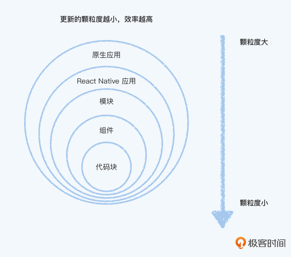 可以看到,快速刷新的逐步降级策略是,从更新颗粒度最小代码块开始的,然后是组件、模块,最后是大颗粒度的 React Native 应用。越小颗粒度的更新,为我们保留了越多原来的状态和环境,我们的开发调试效率也更高。