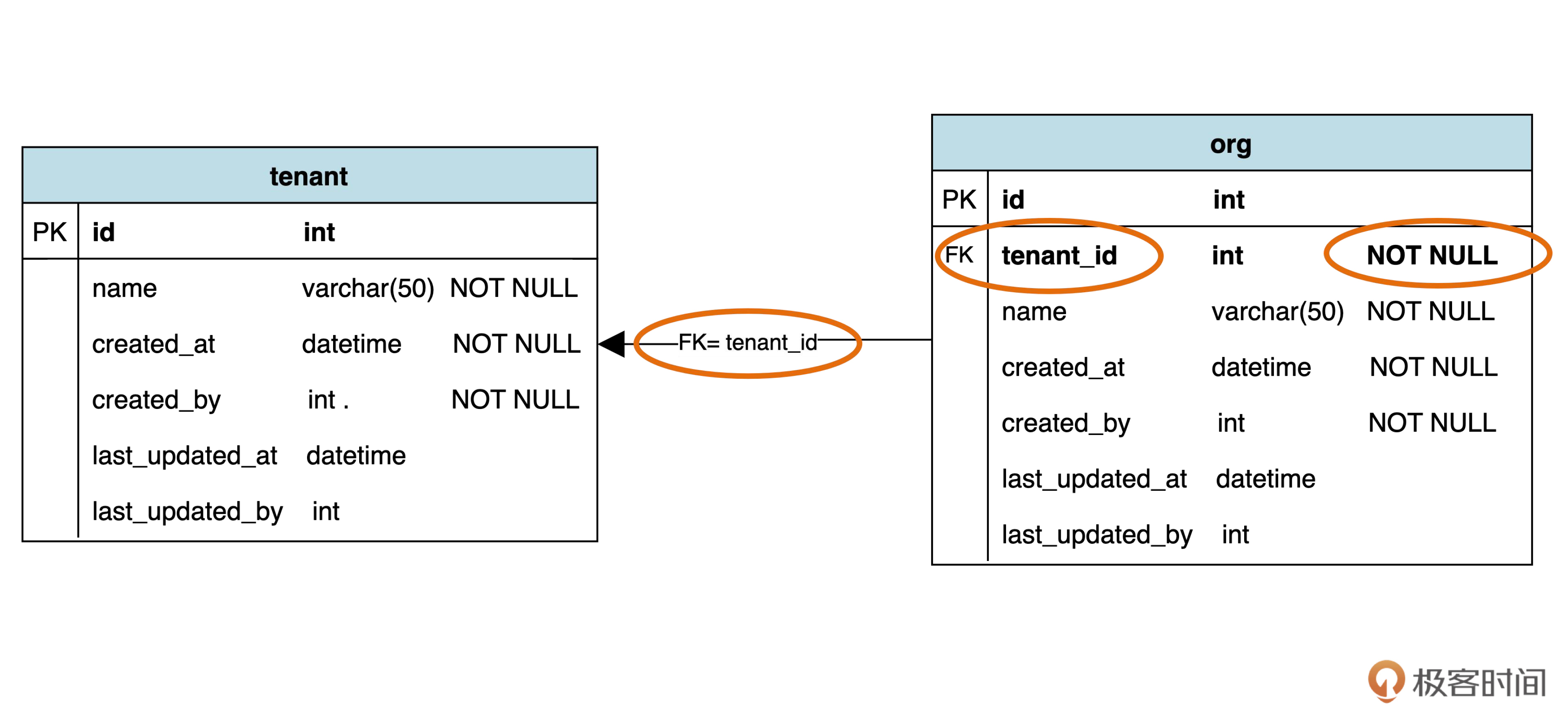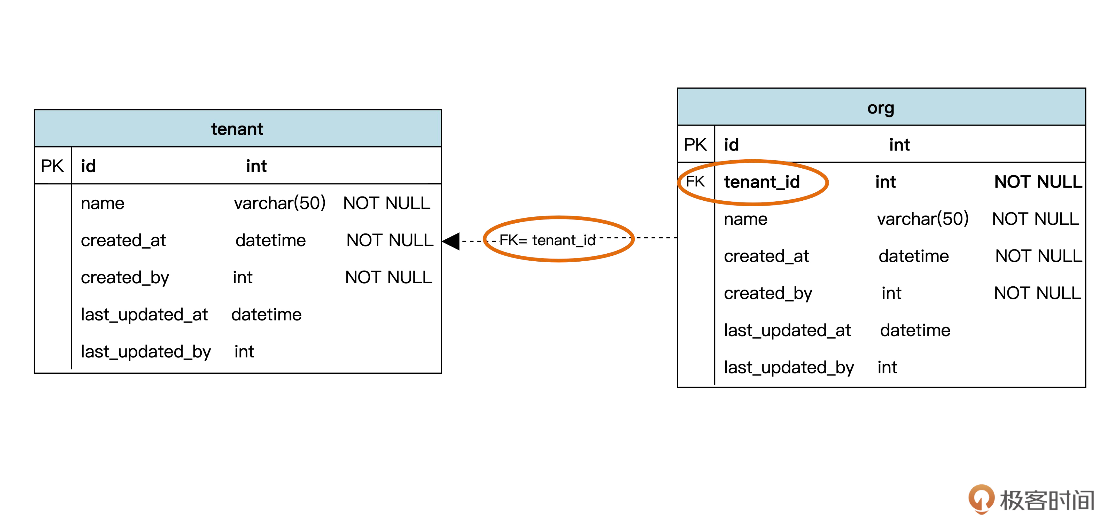 图中的FK(foreign key) 代表外键。FK = tenant_id 说明 org 表中指向 tenant 表的外键是 tenant_id 字段。