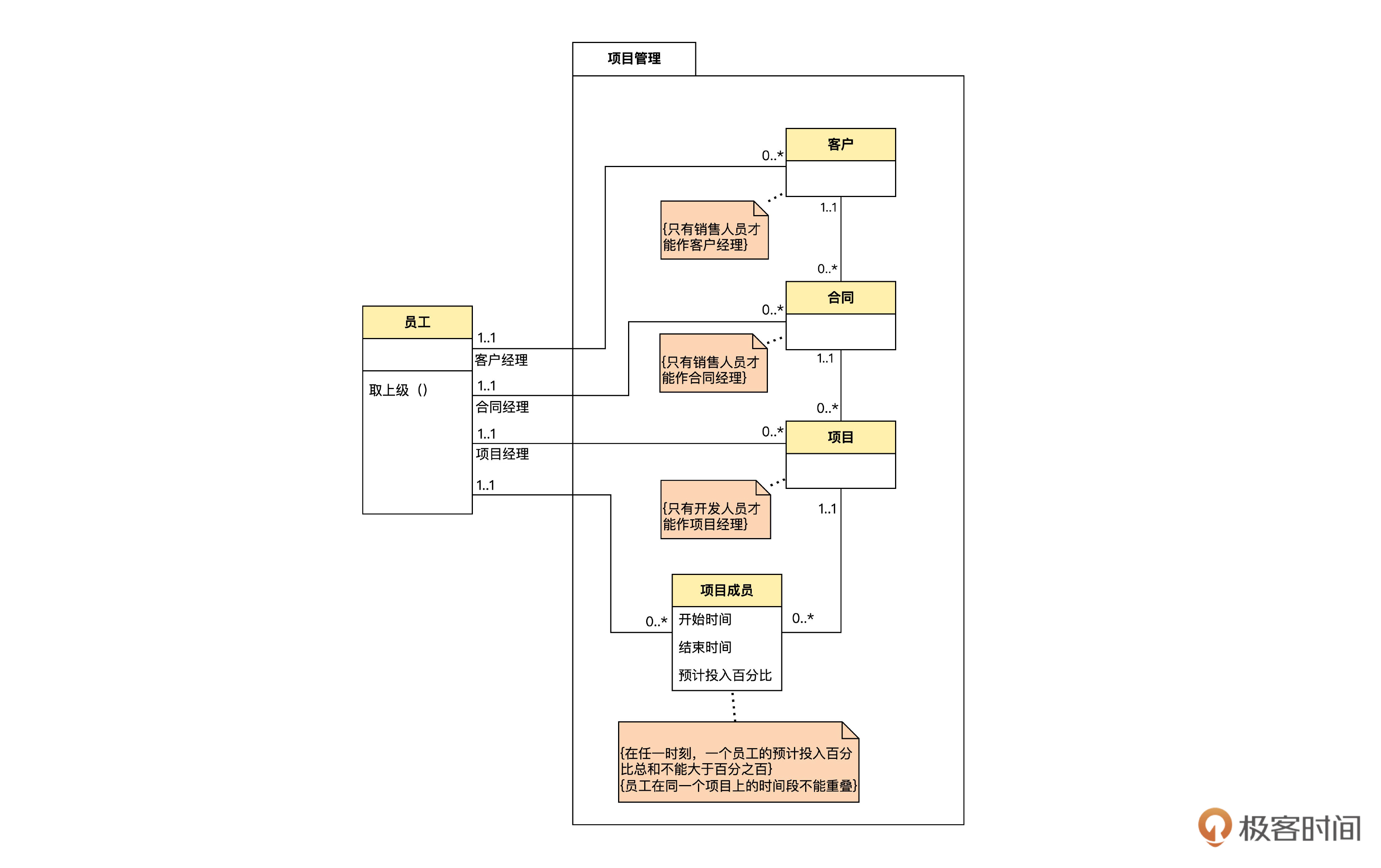 首先,采用UML类图描述的领域模型图是ER图的超集。也就是说,ER图能表达的,领域模型图都能表达;而领域模型图能表达的,ER图未必能表达。因此,使用领域模型图以后,我们就不必再使用ER图了。