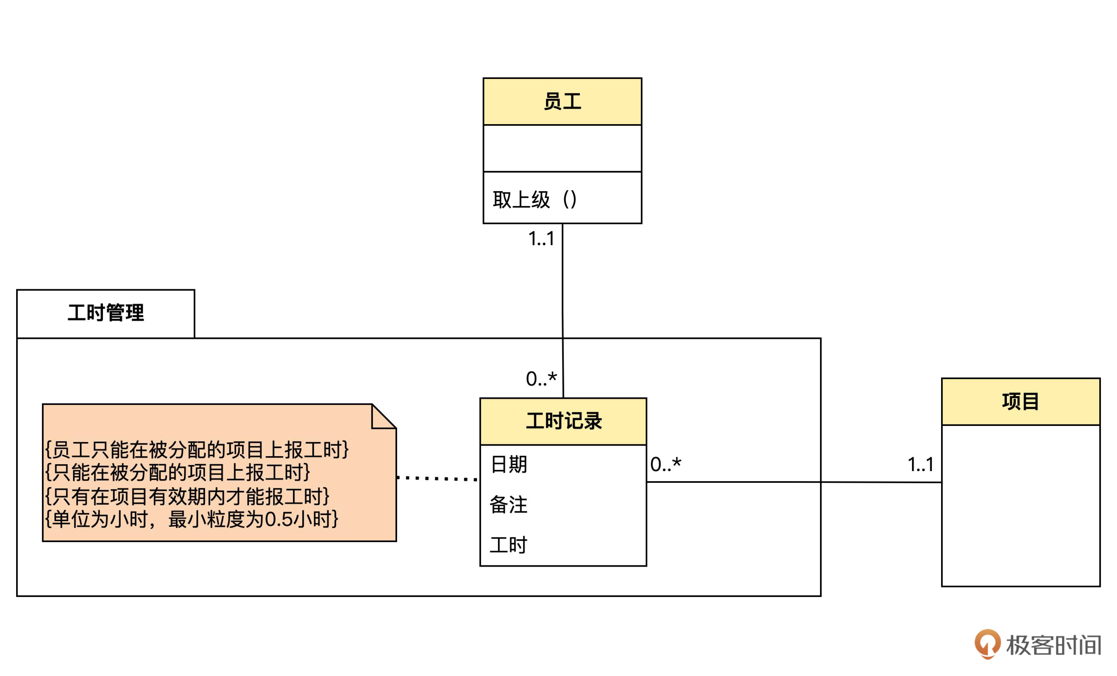完成了项目管理模块,我们来设计最后的工时管理模块。领域模型图如下: