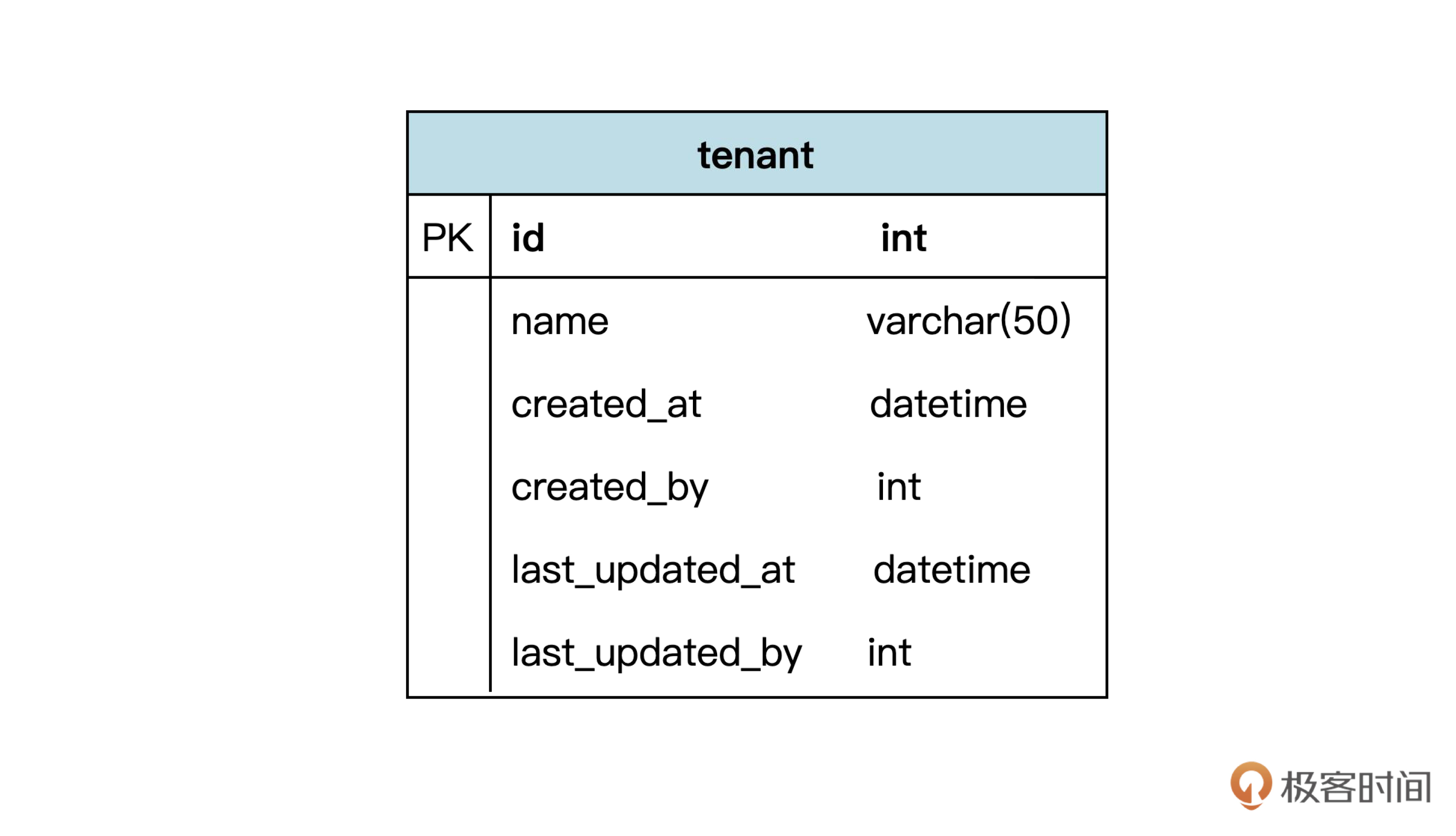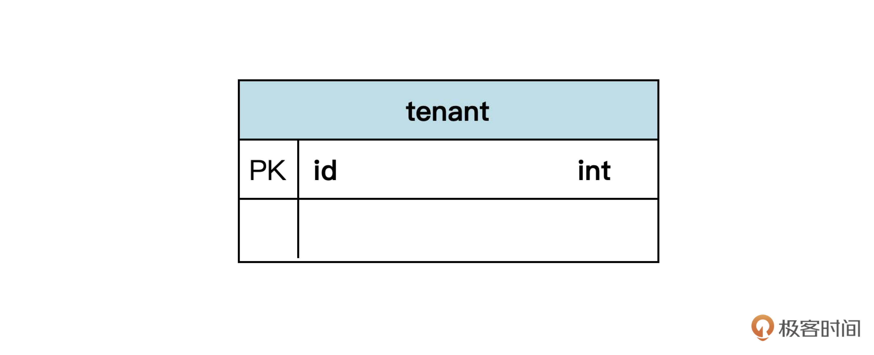 一般来说,一个实体可以映射为一个数据库表。所以,咱们可以先根据租户实体设计出租户表。可以用下面的符号表示: