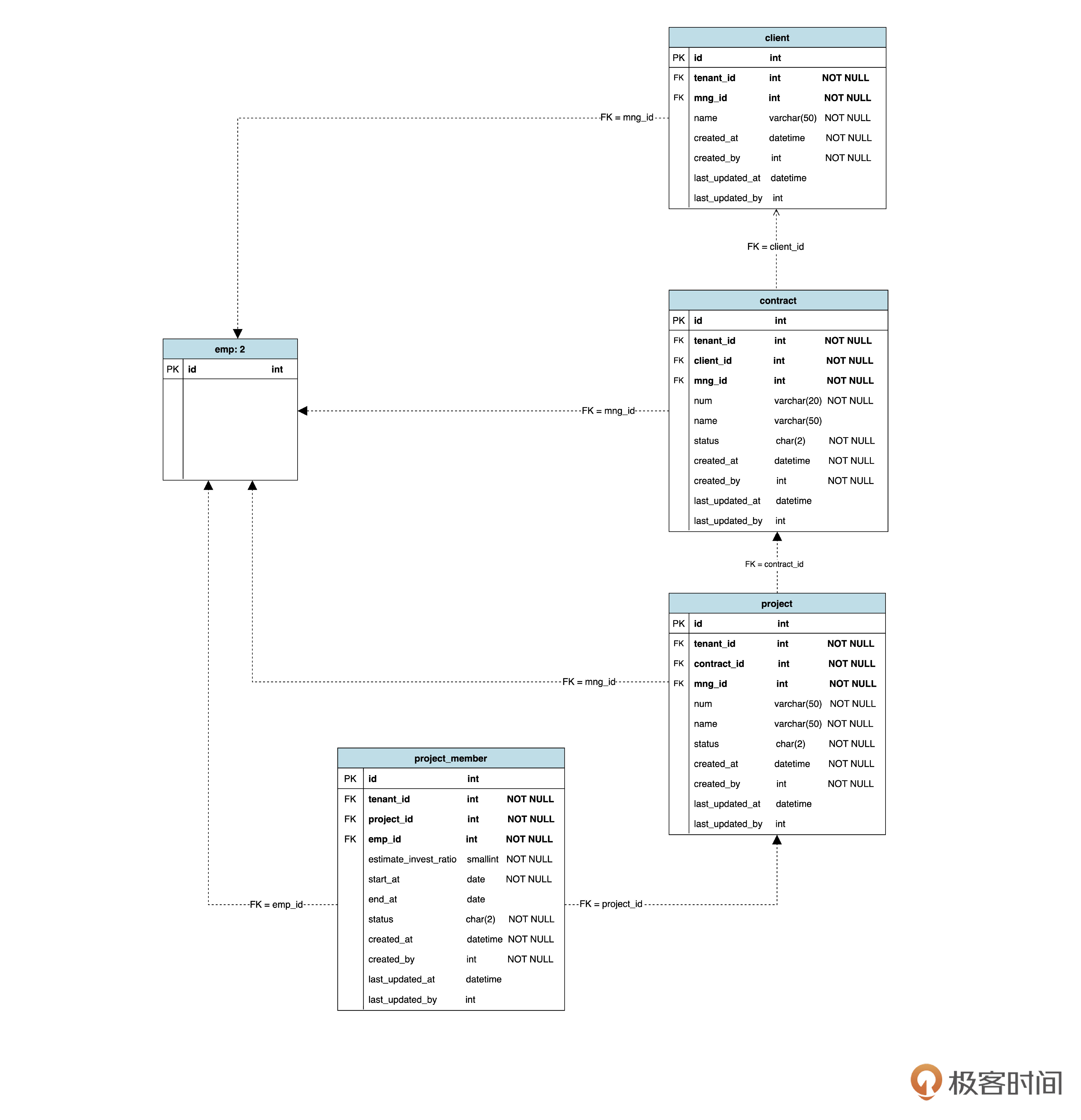 这其实是一种绘图技巧。为了避免整张图像蜘蛛网一样凌乱,我们不打算把所有表都画在同一张图上,而是每个模块画一张。而 emp 表在组织管理中出现过一次,在项目管理中又出现了,所以我们用了 emp: 2 说明这是 emp 表的第 “2” 次出现。