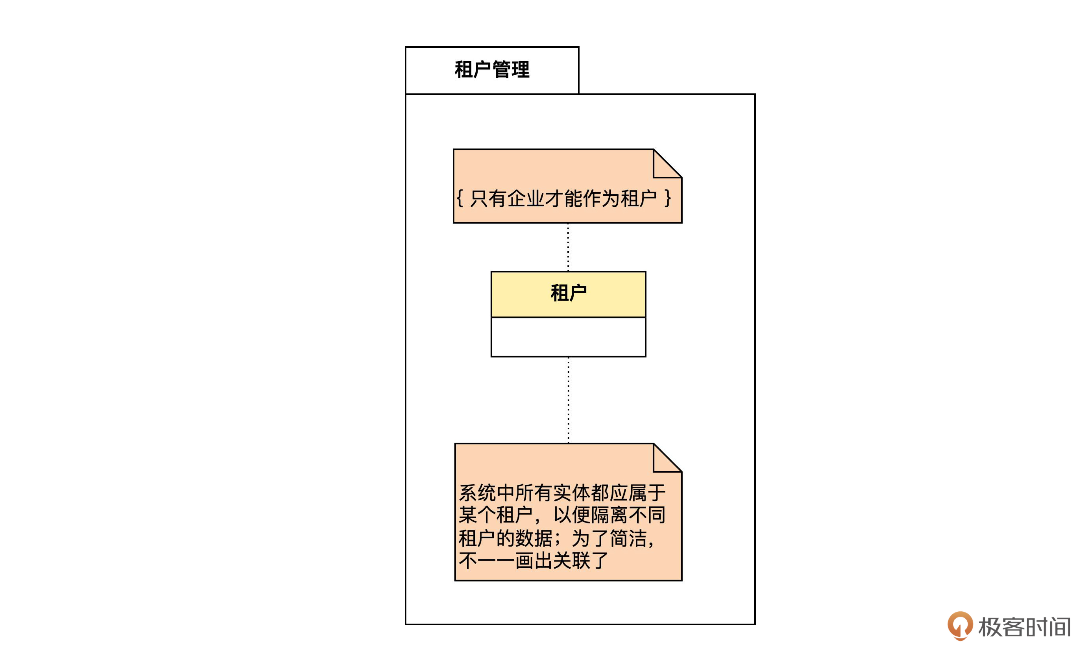 **首先看这个符号的第一行,这里的 tenant 是表的名称。**在领域建模阶段,为了和领域专家进行沟通,模型中使用的都是中文。但建表时,一般要用英文来命名。那问题就来了,怎么保证中英文的一致,从而在实现层面贯彻统一语言呢?