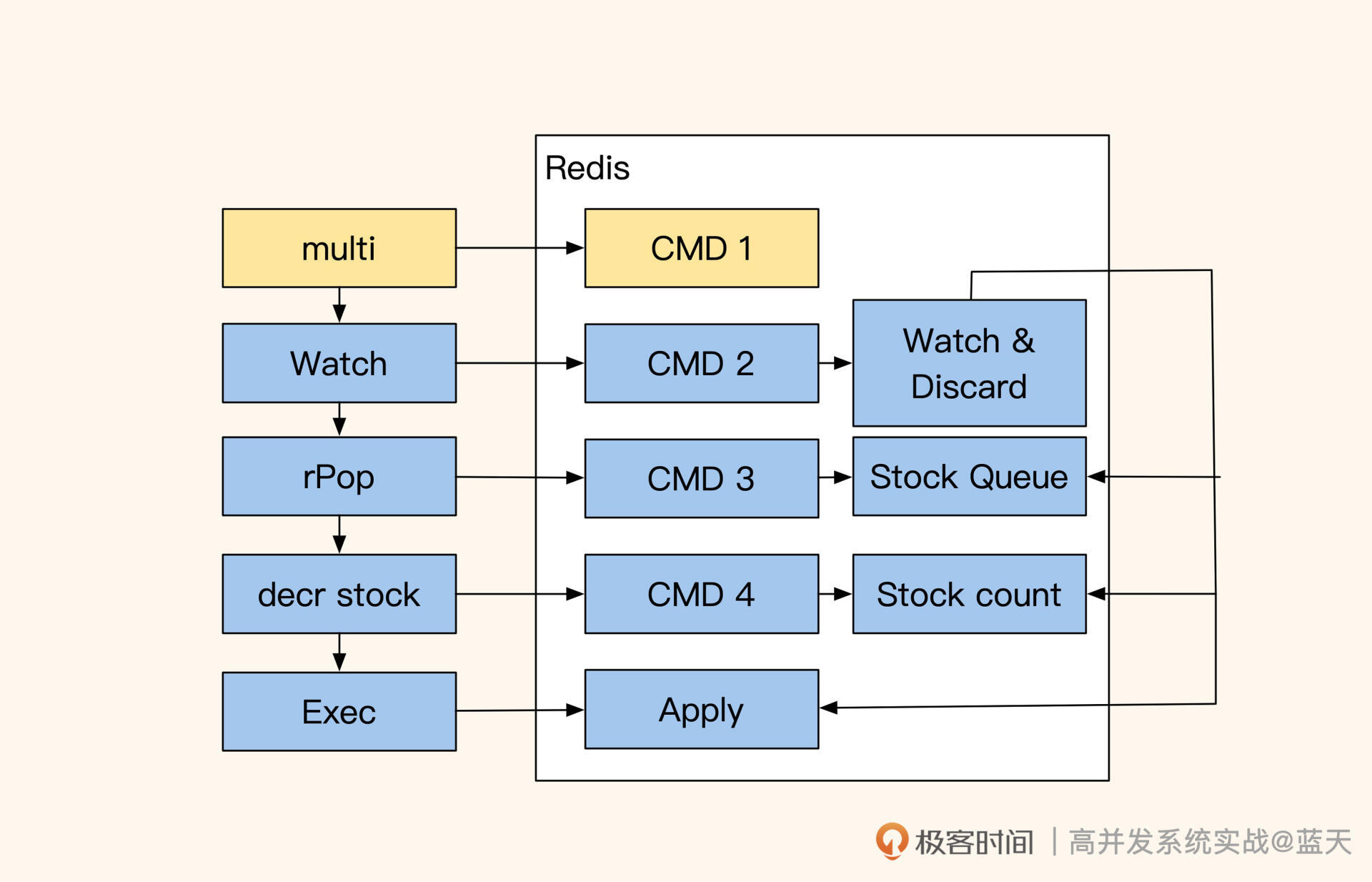 这种利用Redis原子操作减少锁冲突的方式,对各个语言来说是通用且简单的。不过你要注意,不要把Redis服务和复杂业务逻辑混用,否则会影响我们的库存接口效率。